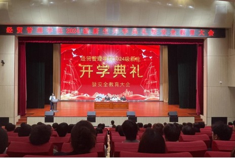 本网讯(经贸管理学院 刘星怡)金秋送爽,丹桂飘香,9月27日晚,经贸管理学院新生开学典礼暨安全教育大会在产教融合中心多媒体报告厅举行。学院领导刘峰、杨力、杨学分以及24级全体辅导员和新生欢聚一堂,报告厅内座无虚席,气氛热烈。大会分两个阶段进行。