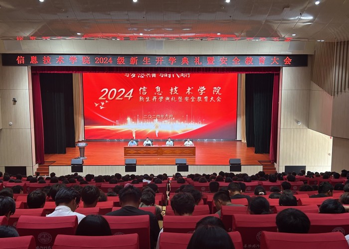 本网讯(信息技术学院 马士君)金秋九月,青春飞扬。9月28日,信息技术学院在产教融合中心报告厅举行2024级新生开学典礼暨安全教育大会。校党委委员、信息技术学院院长沙有闯,信息技术学院党总支书记王胜、副院长雷惊鹏、党总支副书记杜洪宇等学院领导,学院2024级辅导员及2024级700余名新生参加会议。会议由雷惊鹏主持。