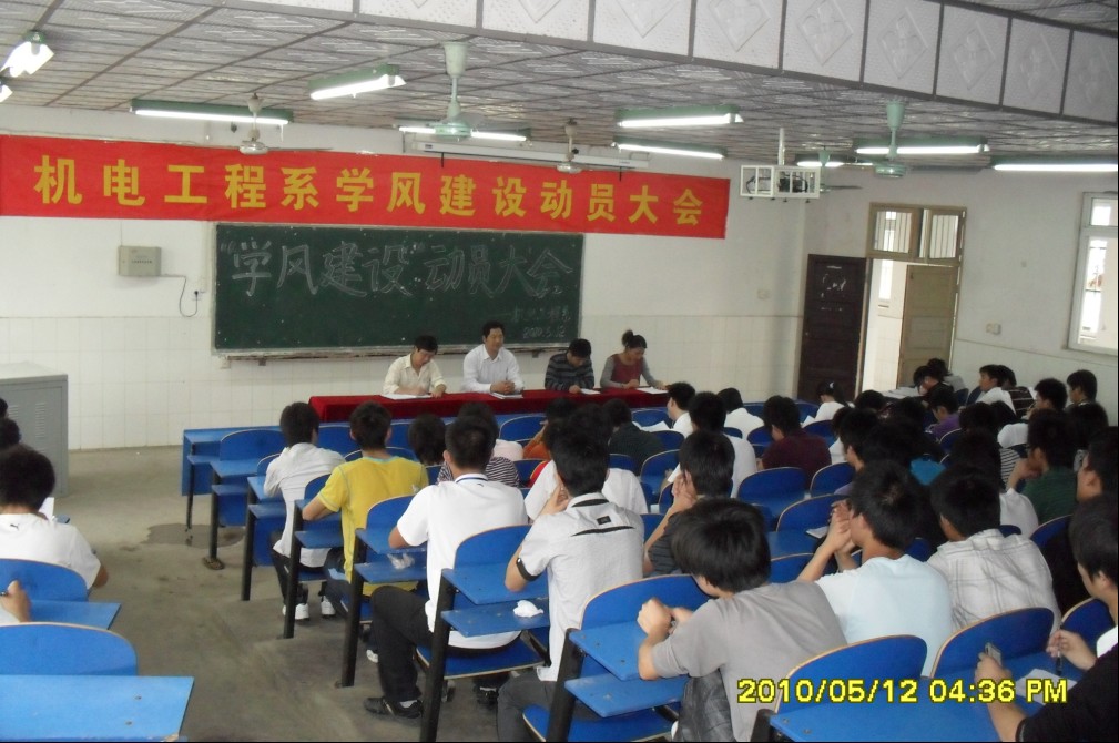 5月12日下午,机电工程系2010年度学风建设动员大会在1号教学楼111教室举行。系党总支书记孙良平、副主任李翔、主任辅导员罗威、辅导员史媛芳及系属各班班主任出席了会议,大会由罗威主持。