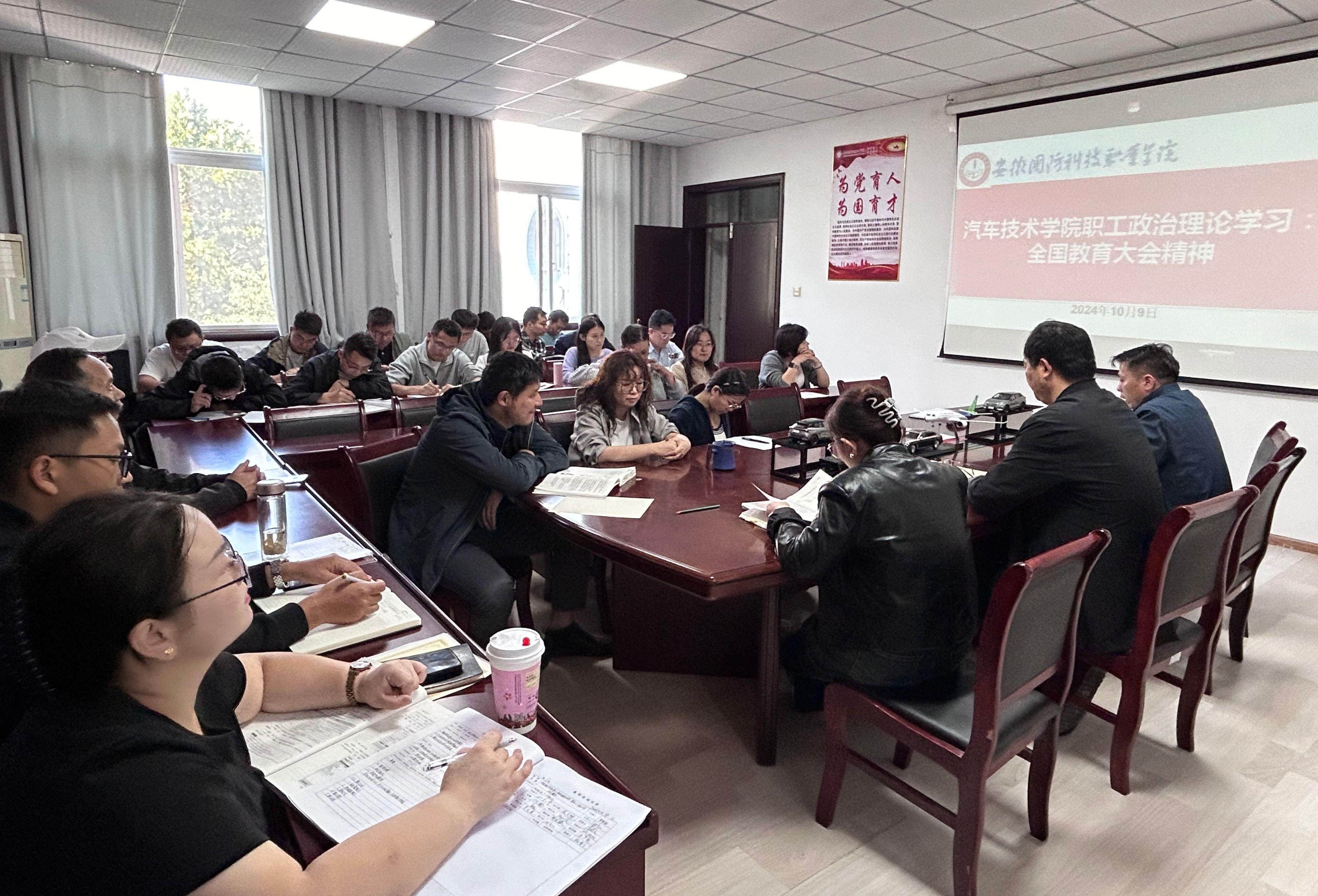 本网讯(汽车技术学院 任培培)为大力弘扬教育家精神,深刻领会习近平总书记在全国教育大会上重要讲话的核心要义,有效推动学院工作再上新台阶,10月9日下午,汽车技术学院召开全体职工会议,开展政治理论学习,并就近期工作作出部署。学院党总支书记孙良平主持会议。