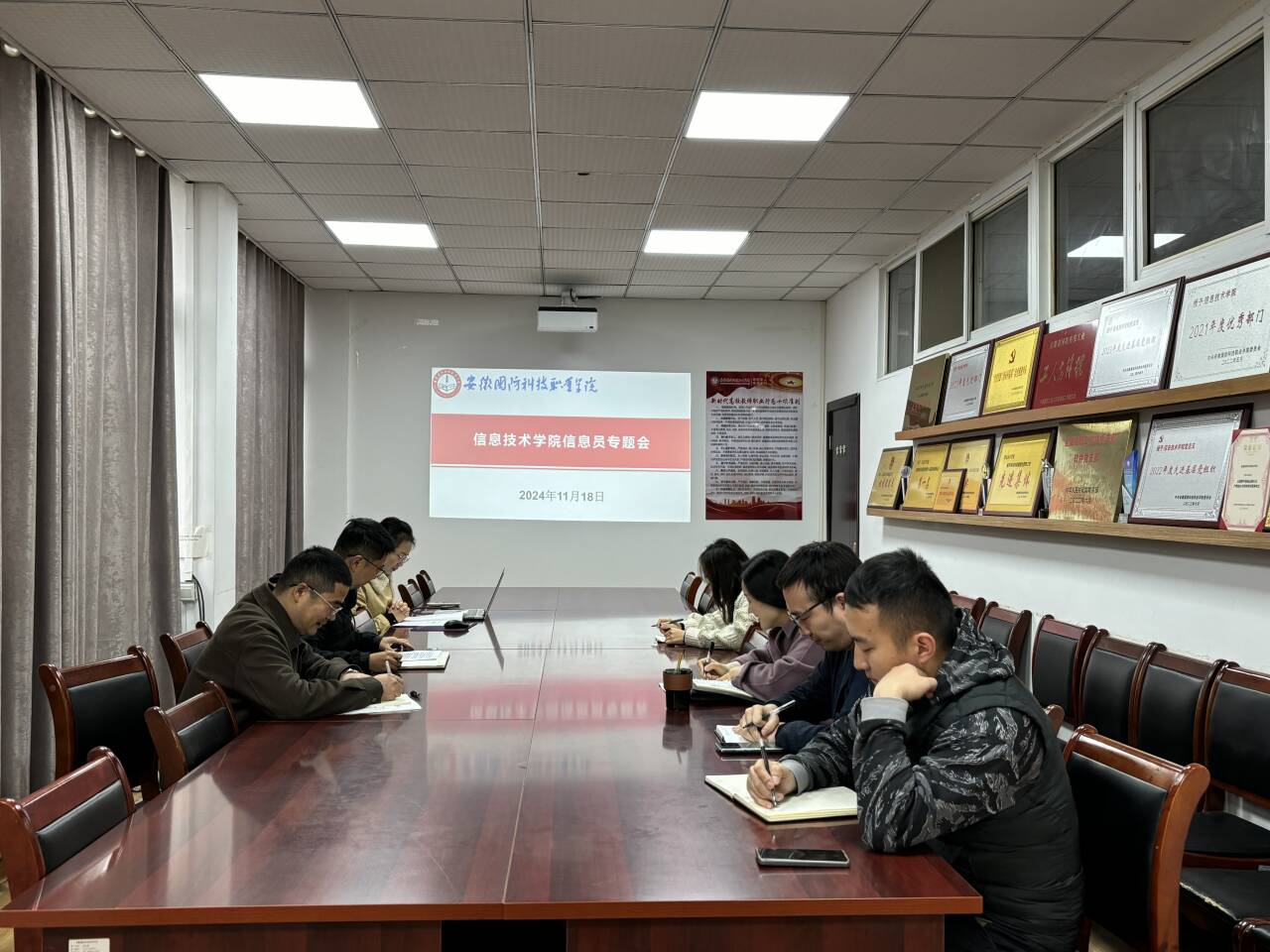 本网讯 为进一步加强和改进新形势下学院宣传思想和新闻宣传工作,健全工作体系,加强网络意识形态安全,11月18日上午,学院在知行楼304会议室召开网络信息员专题工作会议,会议由学院办公室主任戴泽淼主持,学院党总支书记王胜、副书记杜洪宇以及全体网络信息员参加。