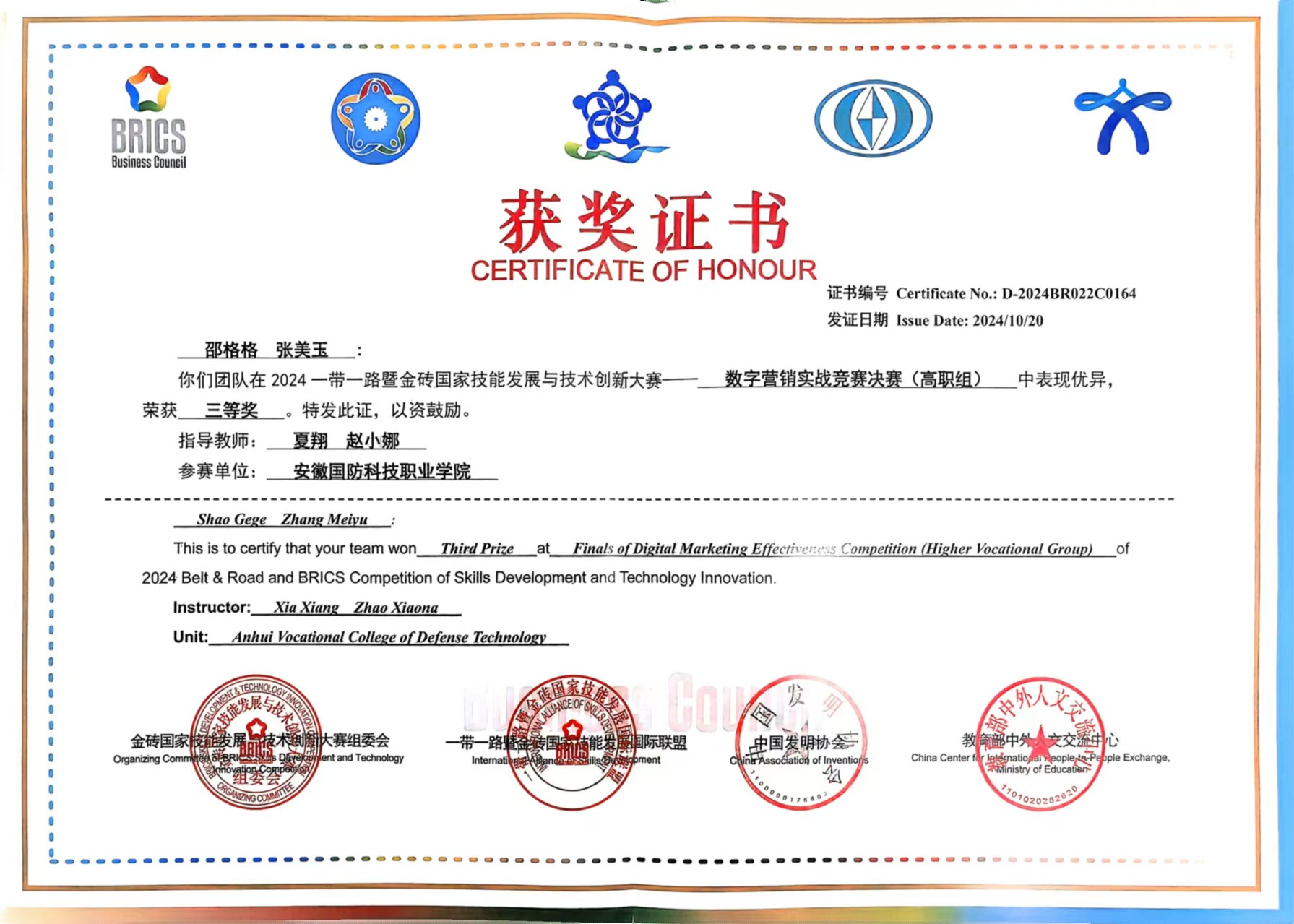 本网讯(经贸管理学院 夏翔)近日,“一带一路暨金砖国家技能发展与技术创新大赛数字营销实战竞赛”赛项总决赛在郑州隆重举行。本次大赛来自全国127支参赛队同台竞技,由万象城官网经贸管理学院老师夏翔、赵小娜指导的电子商务专业学生张美玉、市场营销专业学生邵格格组成的竞赛团队在激烈的竞争中脱颖而出,荣获全国总决赛三等奖。