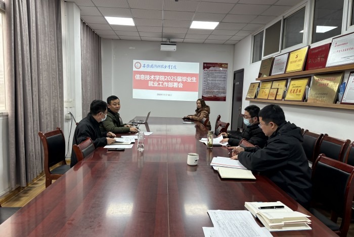 本网讯(信息技术学院 徐祥)1月14日下午,信息技术学院召开2025届毕业生就业工作部署会,重点分析2024届毕业生就业完成情况,安排部署2025届毕业生就业工作。校党委委员、信息技术学院院长沙有闯、信息技术学院党总支书记王胜、党总支副书记杜洪宇、副院长雷惊鹏出席会议,会议由就业专项辅导员徐祥主持。