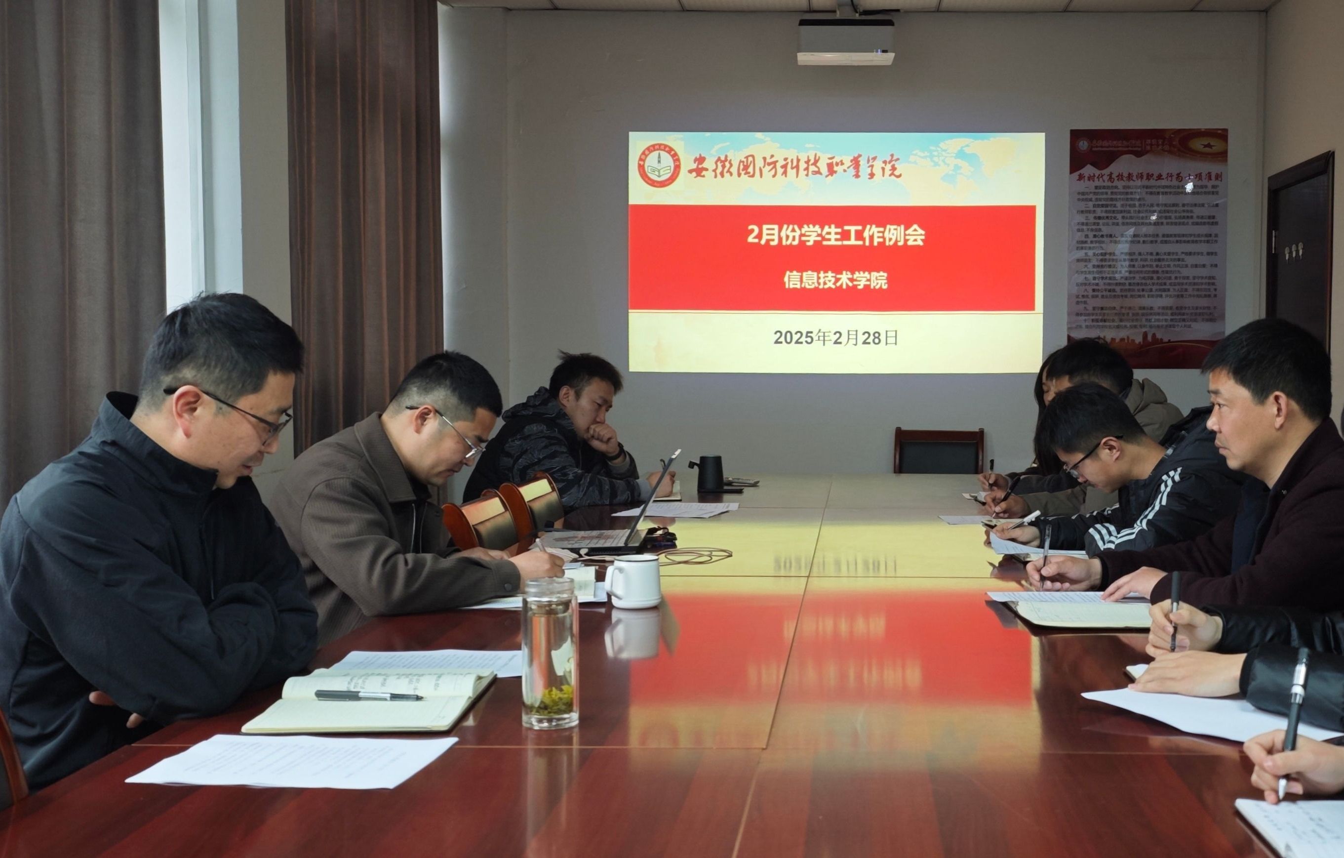 本网讯(信息技术学院 王雪)2月28日,信息技术学院党总支副书记杜洪宇主持召开二月份学生工作总结会,学院党总支书记王胜,学院全体专职辅导员参加会议。