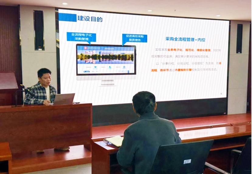 本网讯 为规范学校采购与资产管理工作,提升各单位采购与资产管理人员的业务能力,推动学校采购与资产管理服务平台的高效使用,3月12日下午,国有资产管理办公室举办采购与资产管理服务平台使用培训会,邀请成都思必得信息技术有限公司华东区副总王鑫、北京久其软件有限公司高级实施工程师孙嘉煊作专题讲座,会议由国有资产管理办公室主任韩纪平主持,各部门、单位采购负责人及资产管理员共计50余人参加了本次培训会。