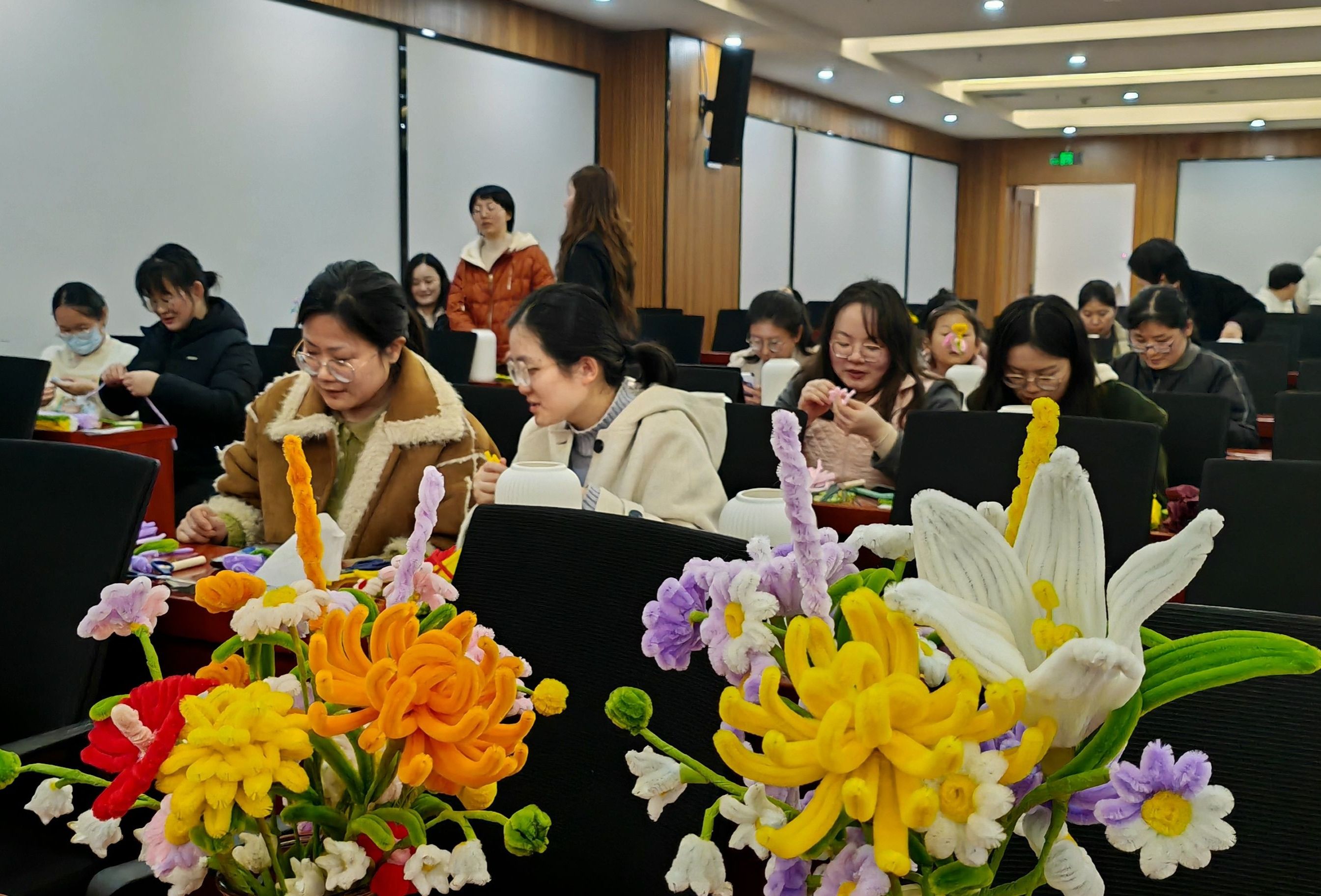 手工扭扭棒花束制作,巧手匠心,传递美好。活动的最后一项是手工扭扭棒花束制作。在制作视频的指导和学生志愿者的协助下,女职工们用五颜六色的扭扭棒制作出一束束精美的花束。每一朵花都凝聚了大家的巧思与匠心,象征着女性如花般绽放的美丽与力量。活动结束后,大家纷纷拍照留念,并将花束带回家中,为节日增添了温馨与浪漫的氛围。