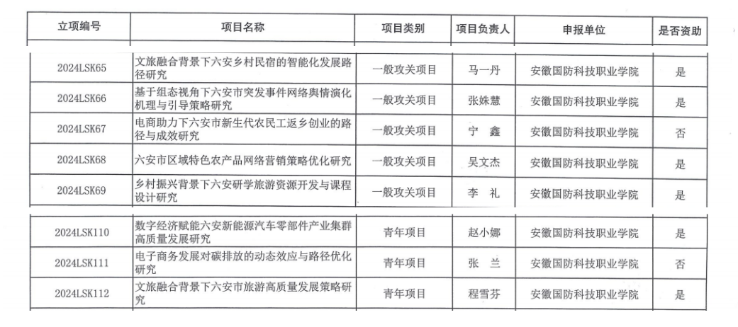 本网讯(经贸管理学院 李礼)近日,六安市委宣传部与市社科联联合发布了《2024年度六安市社会科学创新发展研究课题立项的通知》,在全市114项立项课题中,经贸管理学院表现亮眼,成功获批5个一般攻关项目和3个青年项目,立项数量实现了较往年的重大突破。
