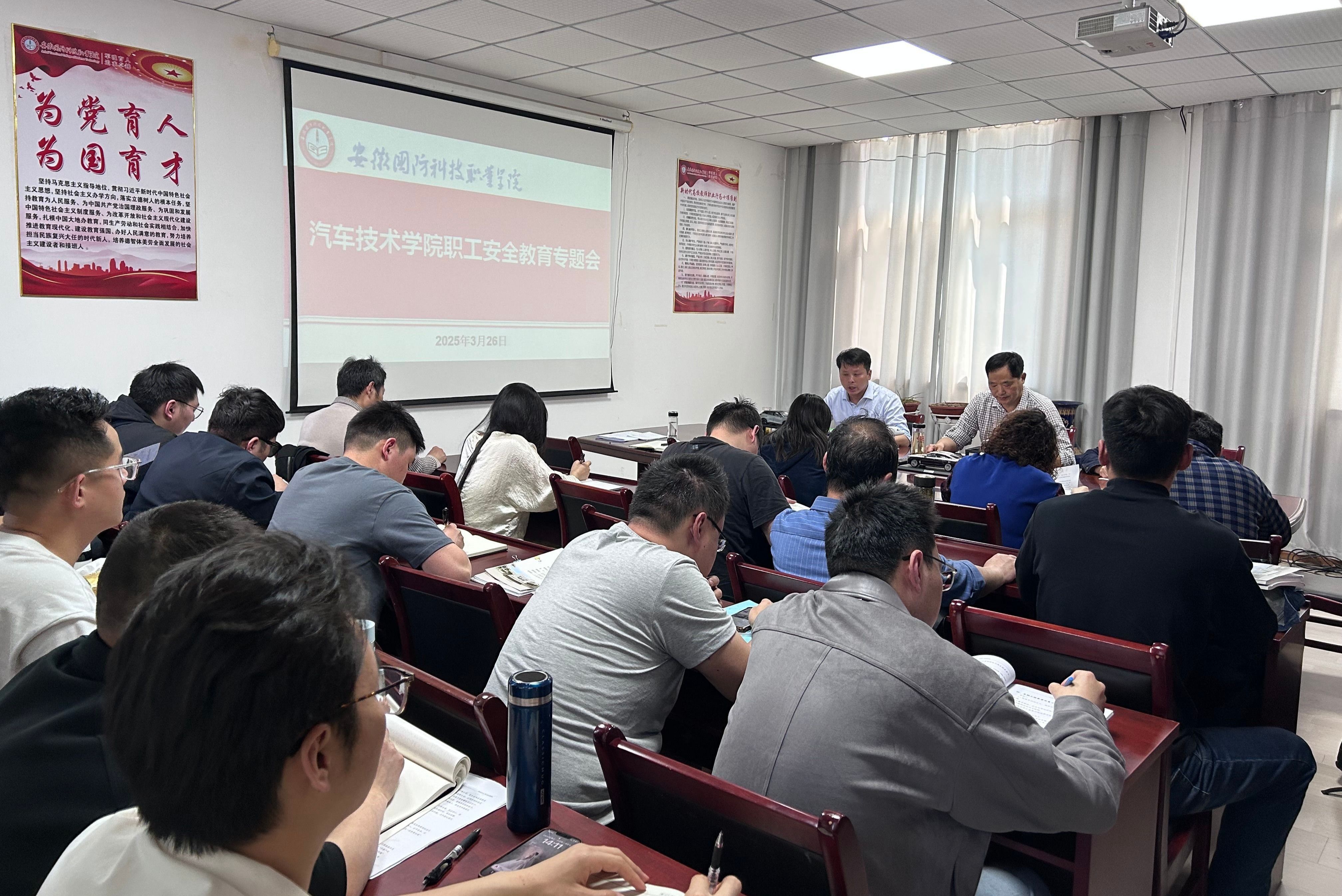 本网讯(汽车技术学院 任培培)为进一步学习贯彻习近平总书记关于安全生产的重要论述精神,落实学校安全管理要求,提升学院职工的安全防范意识与应急处理能力,3月26日下午,汽车技术学院召开全院职工安全教育专题会,专题学习上级有关文件精神,落实各项安全稳定工作。会议由副院长(主持工作)姜继文主持。