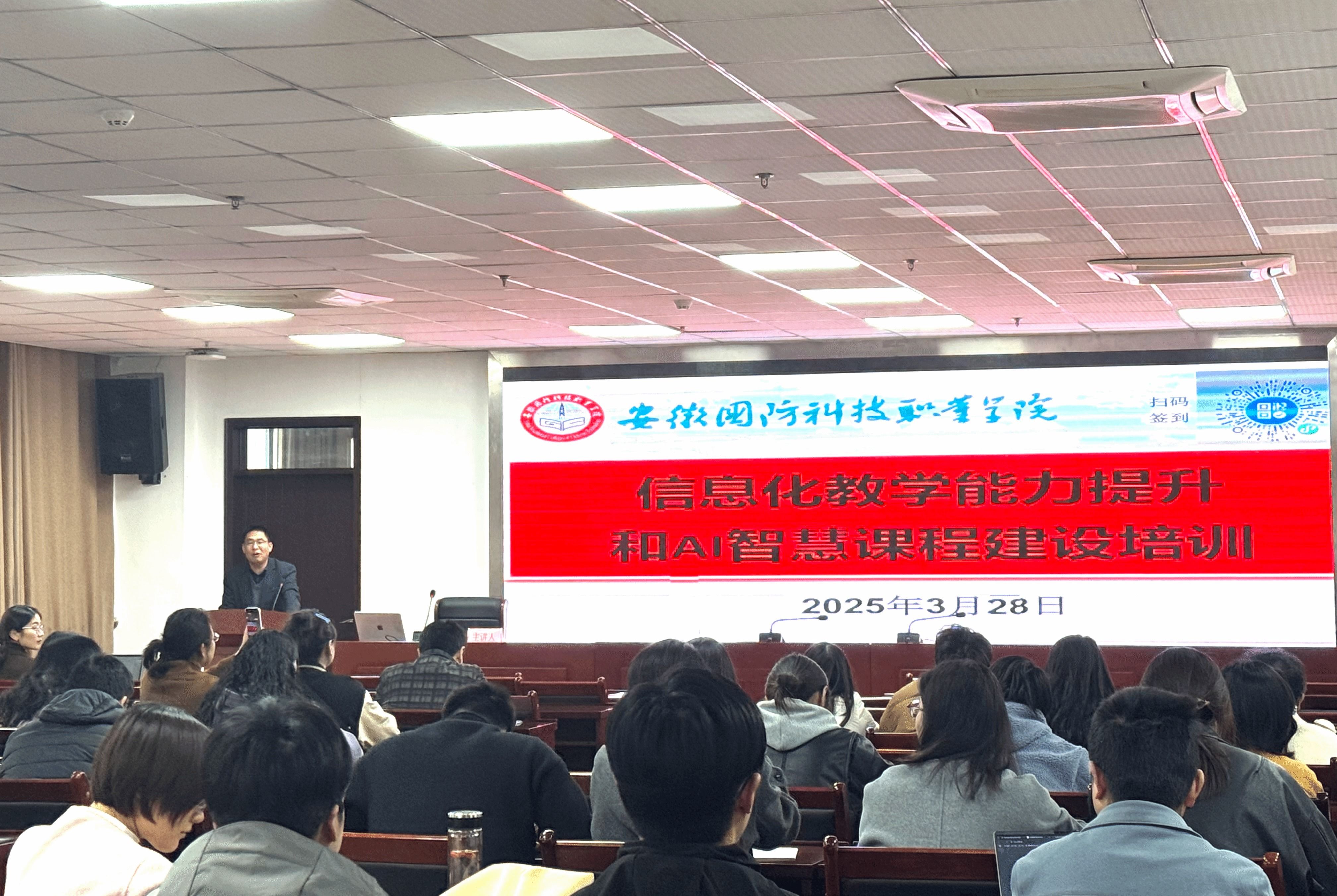 本网讯 为推动人工智能技术在教学全过程中的深度融合,提升学校教师数字素养和信息化教学水平,促进优质课程建设工作,3月28日下午,教务处在秉心楼12楼会议室举办“教师信息化教学能力提升和AI赋能智慧课程建设”专题培训会。各教学院部系(教研室)主任、省校级在研课程类项目负责人、学校近3年新进教师共百余人参加培训会,此次培训由校党委委员、教务处处长朱修传主持。