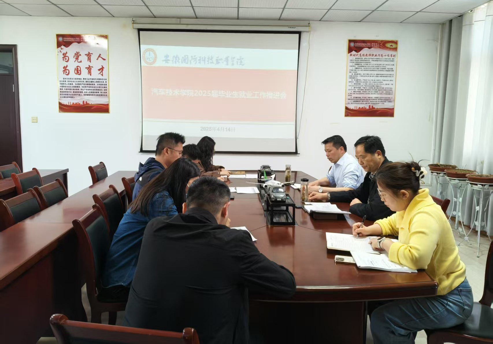 本网讯(汽车技术学院 黄世超)为全面落实教育部“稳就业”“保就业”决策部署,落实好安徽省和学校就业工作精神和部署,切实推进2025届毕业生高质量充分就业,4月12日下午,汽车技术学院召开2025届毕业生就业工作推进会,部署安排近期就业工作。汽车技术学院党政班子成员、就业辅导员及毕业班辅导员参加会议。