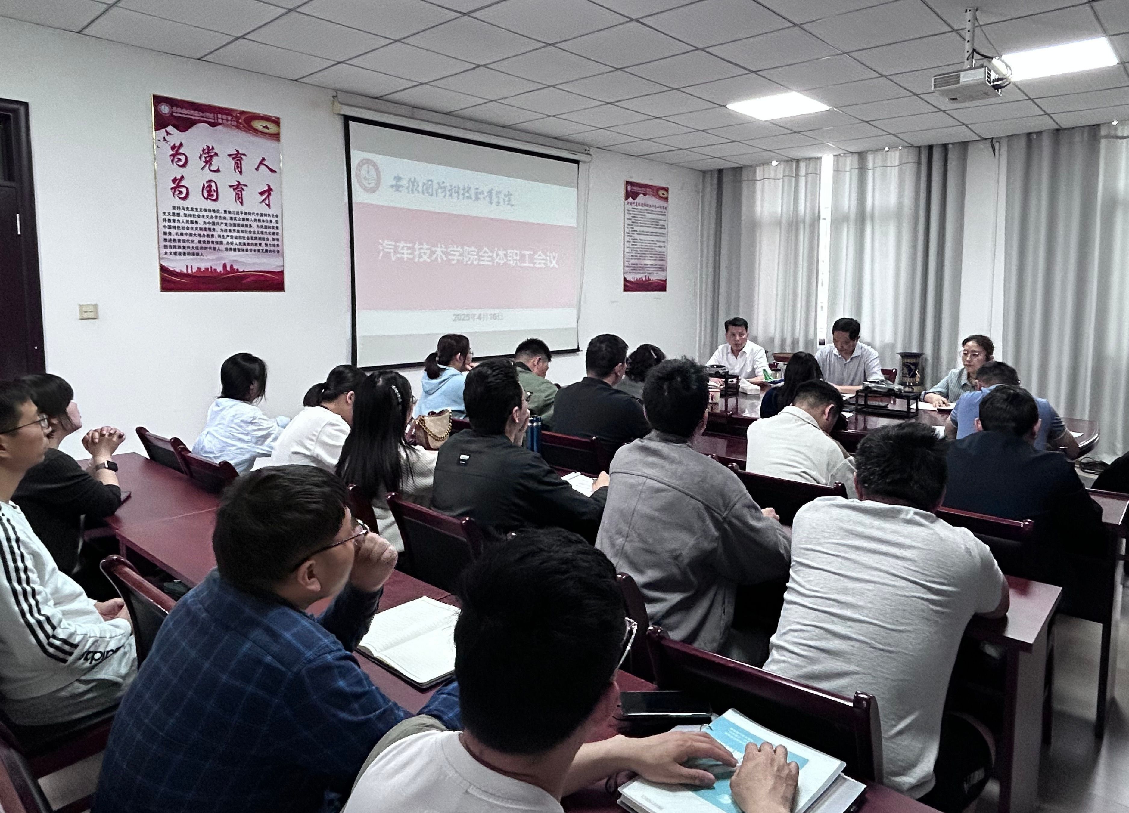 本网讯(汽车技术学院 任培培)为深入学习贯彻习近平总书记关于教育的重要论述,有效落实上级决策部署,4月16日下午,汽车技术学院召开全体职工会议,就近期学院重点工作作具体部署。副院长(主持工作)姜继文主持会议。