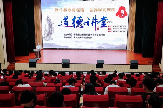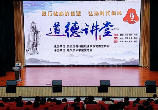 本网讯(电气技术学院 陈俊)为培育和践行社会主义核心价值观,大力弘扬中华民族传统美德,营造崇德向善、诚实守信、践行社会主义核心价值观的良好氛围,推进社会主义核心价值观融入校园文化建设,6月18日下午,由校党委宣传部主办、电气技术学院党总支承办的“践行核心价值观,弘扬时代新风”主题道德讲堂在产教融合中心多功能报告厅隆重举行。电气技术学院党总支副书记(主持工作)张丽、副院长江治国,党委宣传部副部长朱其阳,电气技术学院全体辅导员和全校近300名学生代表参加了此次活动。