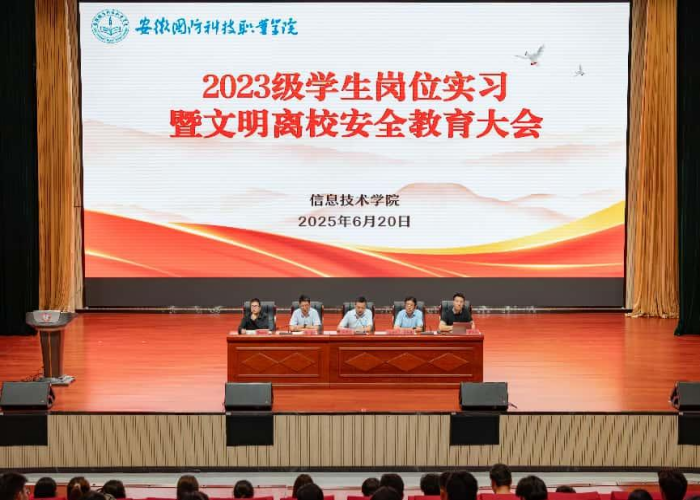 本网讯(信息技术学院 霍国庆)为帮助学生进一步明确岗位实习的意义及要求,推动岗位实习工作顺利开展,6月20日晚,信息技术学院在产教融合中心多媒体报告厅召开2023级学生岗位实习暨文明离校安全教育大会。校党委委员、信息技术学院院长沙有闯,信息技术学院党总支书记王胜、副书记杜洪宇、副院长雷惊鹏,毕业班辅导员及2023级全体学生参加会议。会议由雷惊鹏主持。