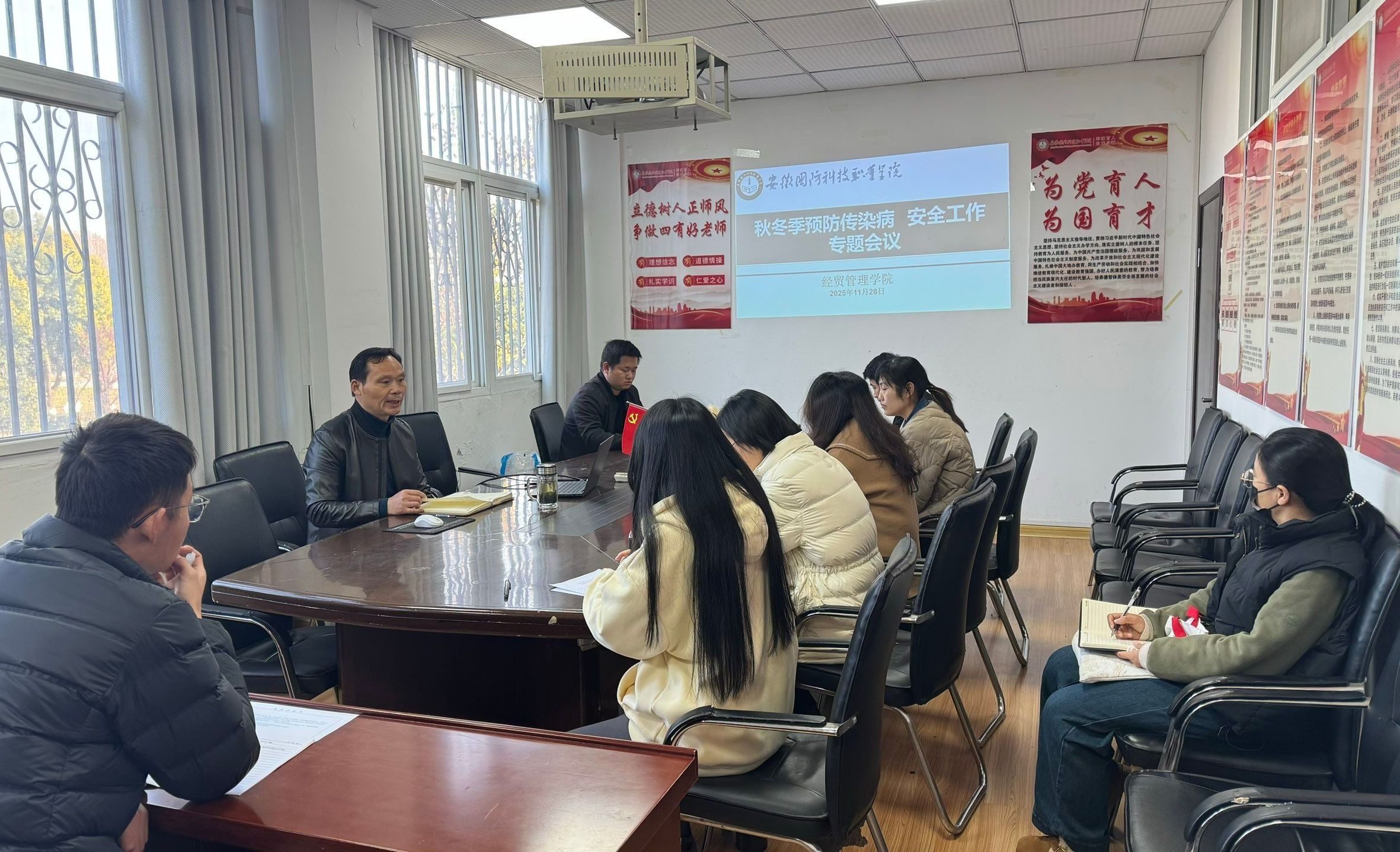 本网讯(经贸管理学院 张洋洋)为扎实做好秋冬季预防传染病和安全工作,切实保障学生生命财产安全与校园稳定,11月28日,学院党总支书记刘峰主持召开专题会议,进一步压实责任,落实预防传染病和安全工作举措,全体专兼职辅导员参加。