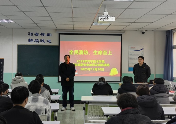 本网讯(汽车技术学院 刘晓宇)为落实学校消防安全主体责任,切实提高广大学生、教职工消防安全意识和自救互救能力,坚决防范和遏制火灾事故发生,12月10日下午,汽车技术学院组织开展“2025年汽车技术学院实验实训室消防安全培训及消防演练”活动。