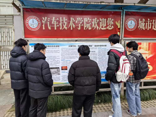 在“一站式”社区内精心布置的展板前,吸引了众多学子驻足观看。固态电池展板系统介绍了其原理、技术优势及对未来新能源汽车产业的革命性影响,前沿科技引发了同学们的浓厚兴趣与热烈讨论。长安汽车历史展板则通过生动的图文,梳理了这家民族汽车工业代表从筚路蓝缕到开拓创新的辉煌历程,增强了学生的行业认同感与自豪感。