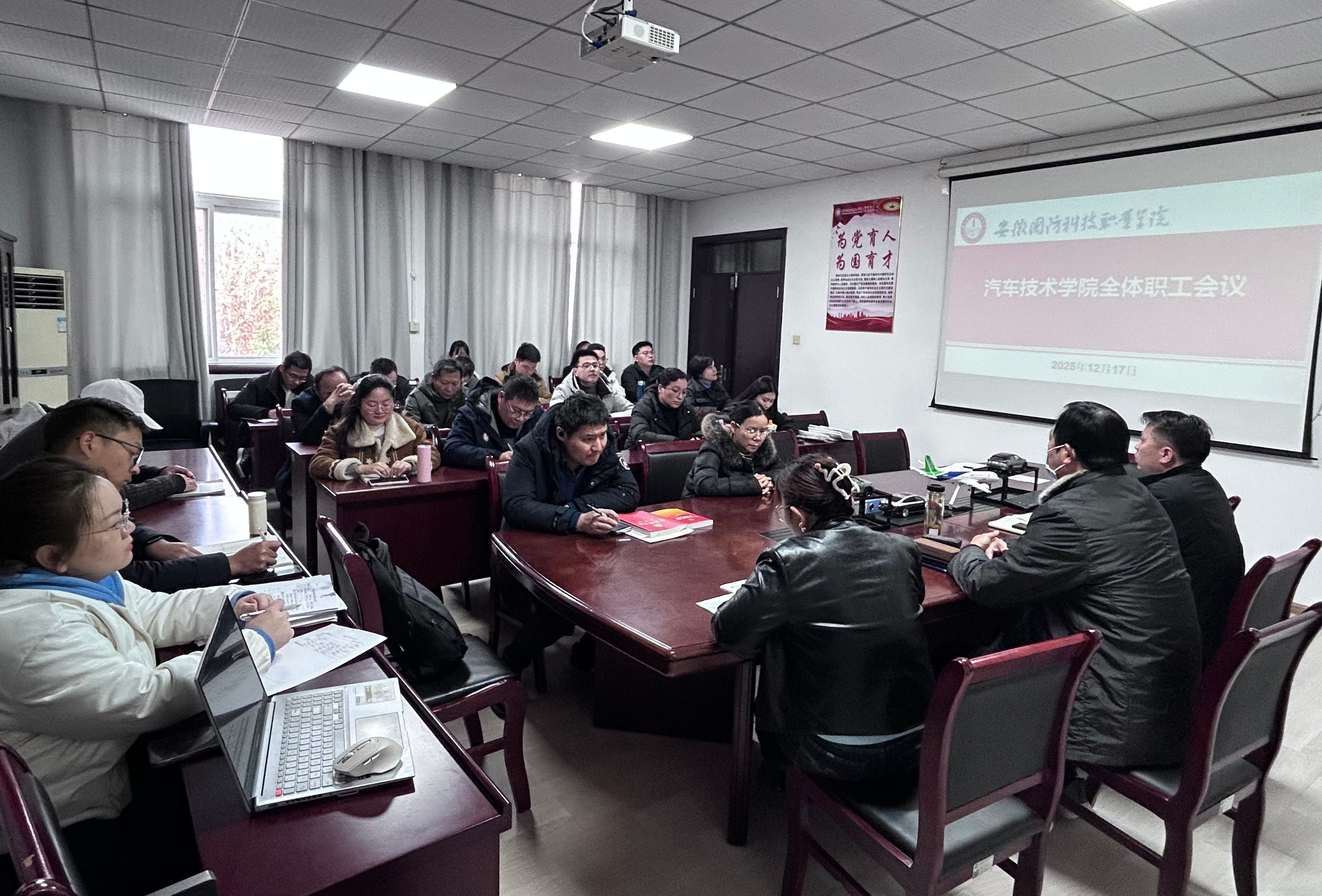 本网讯(汽车技术学院 任培培)为深入学习贯彻党的二十届四中全会精神,积极贯彻落实上级决策部署,12月17日下午,汽车技术学院召开全体职工会议,开展政治理论学习及反诈宣传等学习教育,部署安排近期重点工作,副院长(主持工作)姜继文主持会议。