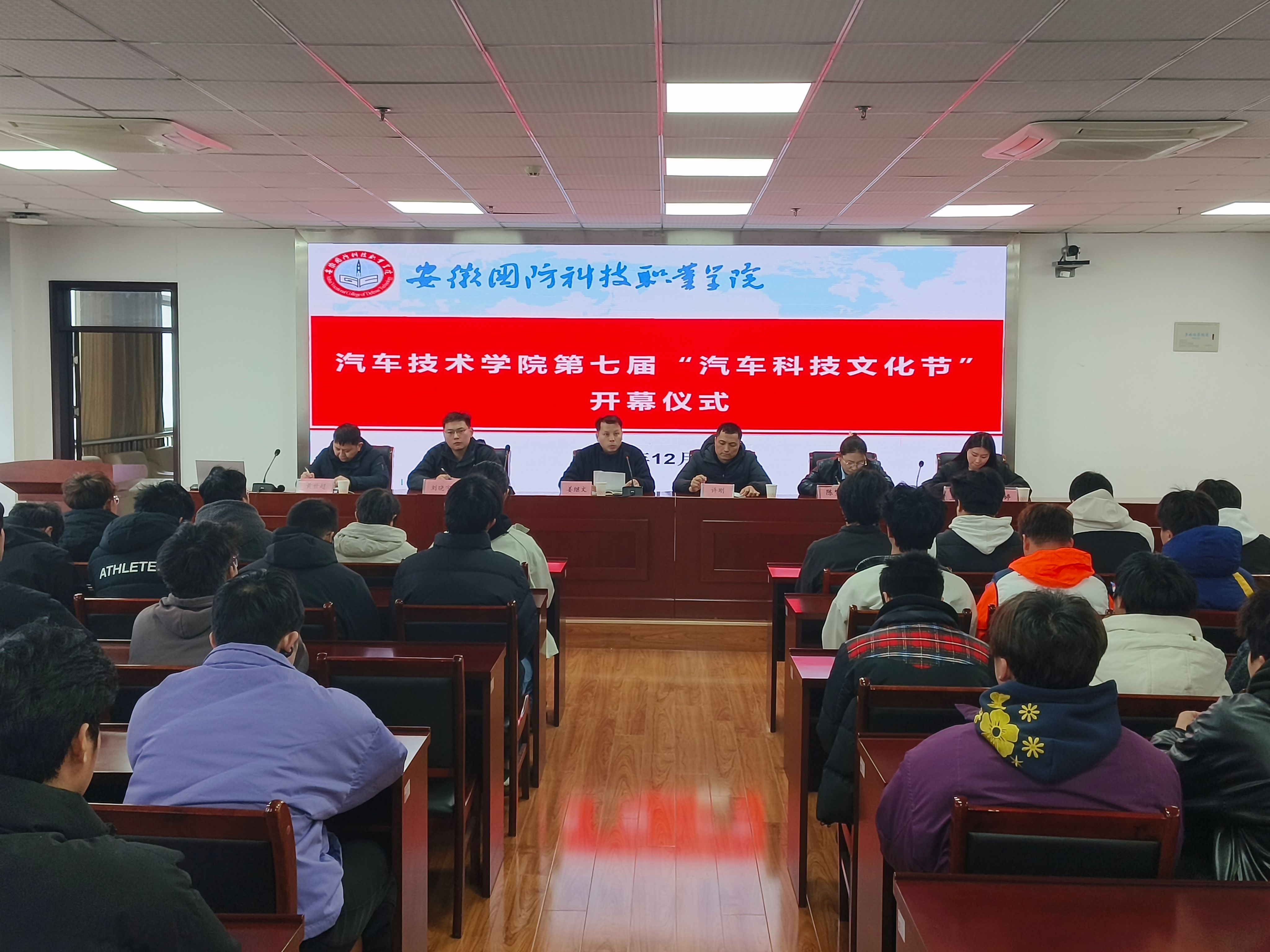 本网讯(汽车技术学院 徐婷婷)为深入贯彻落实学校2025年党政工作要点部署和学校“一院一品”校园文化建设工作要求,12月17日下午,汽车技术学院隆重举行第七届“汽车科技文化节”开幕仪式,现场邀请了合肥长安汽车有限公司高级工程师许刚出席仪式,汽车技术学院副院长(主持工作)姜继文,党总支副书记陈梦雅、辅导员黄世超、社团指导老师刘晓宇及学生代表出席本次开幕式,仪式由汽车技术学院团总支书记徐婷婷主持。
