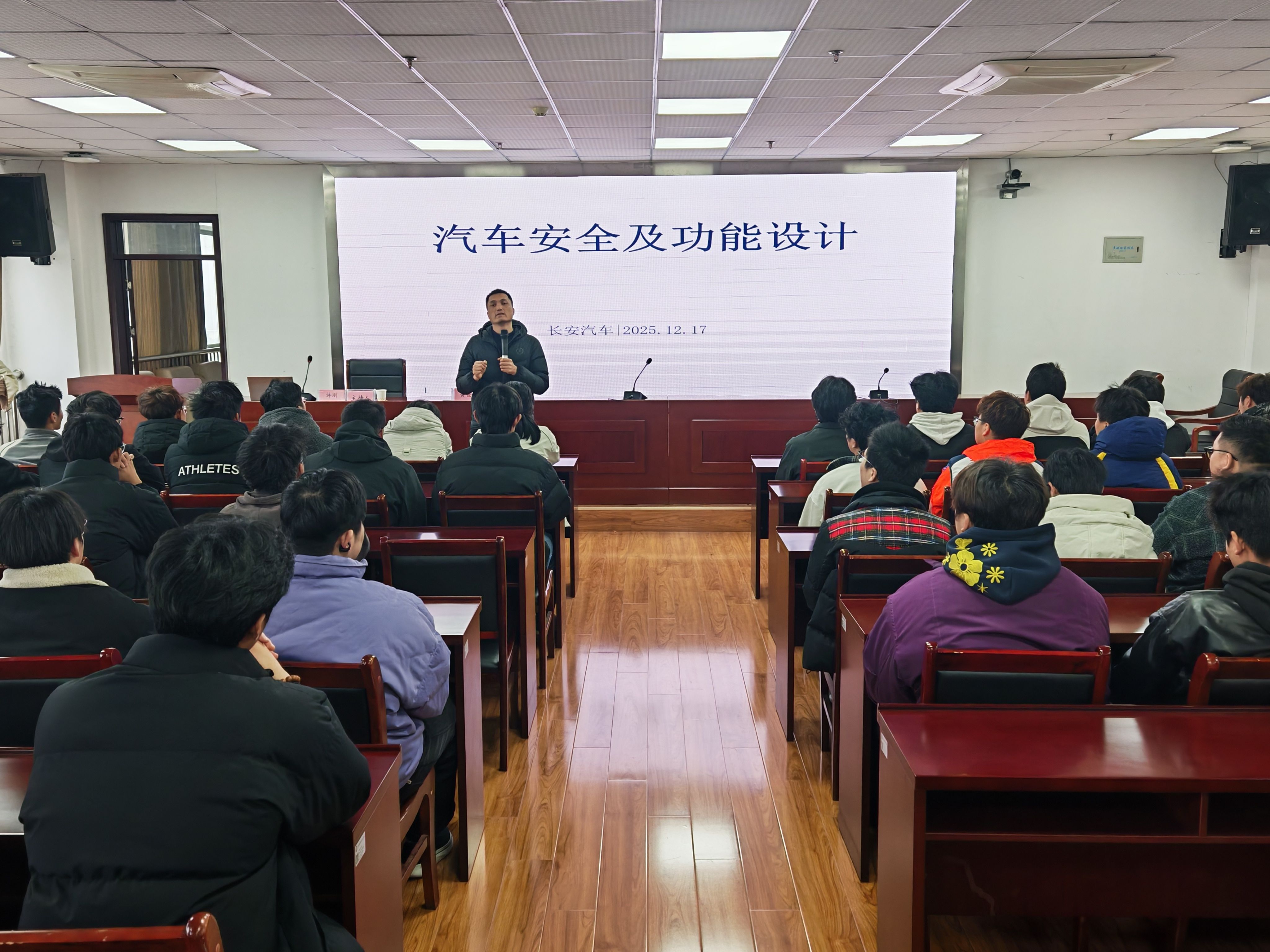 随后,许刚围绕汽车安全及功能设计内容开始专业讲座,以深厚的专业积淀和生动的案例剖析,深入浅出地讲解了智能网联时代下汽车主被动安全技术的发展趋势与实际应用。他结合长安汽车在自动驾驶、碰撞预警、电子稳定系统领域的创新实践,强调安全始终是汽车技术创新的底线与核心。讲座中,学生们专注聆听、积极互动,现场掌声不断,充分展现了对未来汽车科技的热切关注与思考。