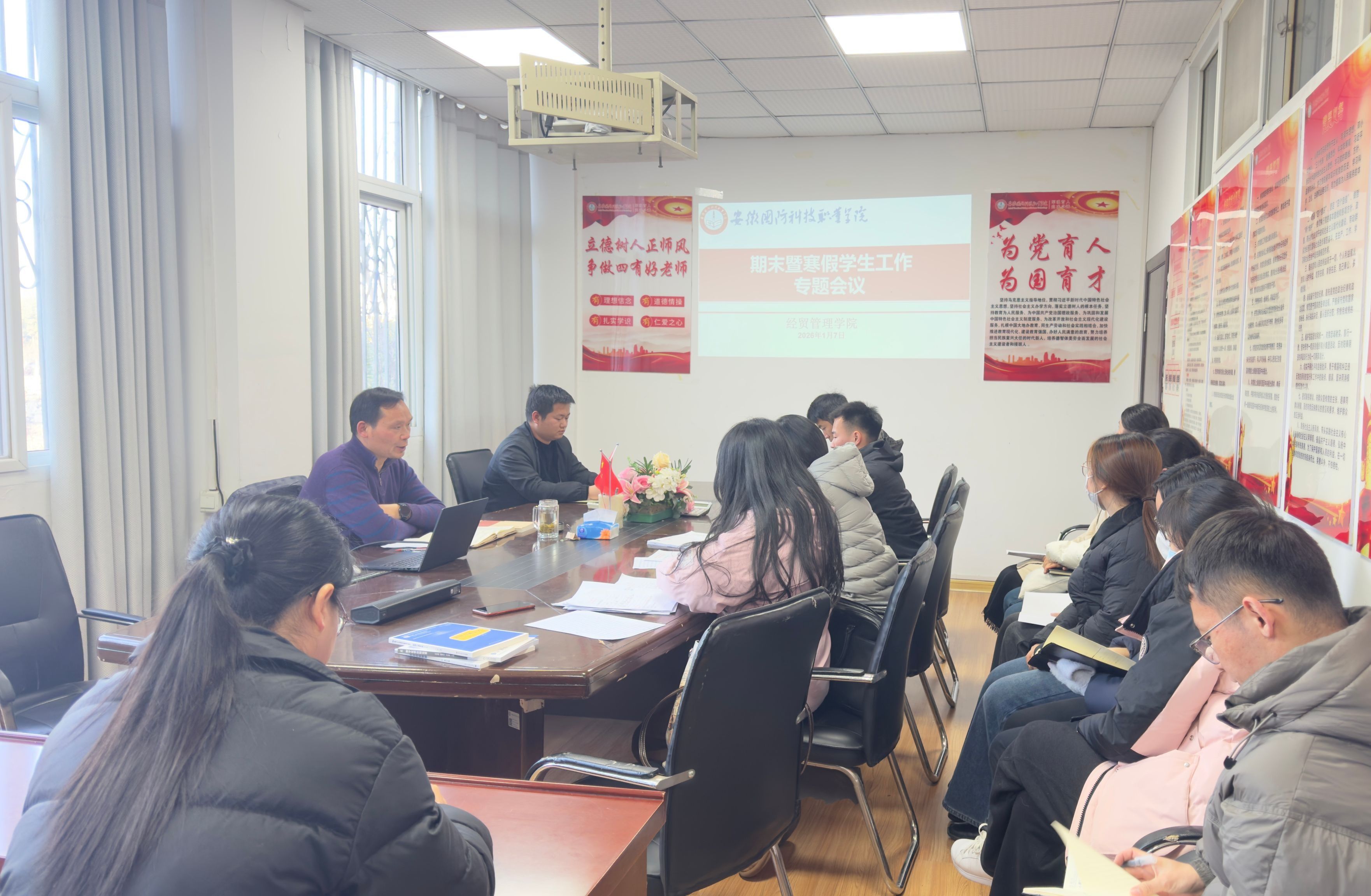 高度重视,精心部署。1月7日,学院党总支书记刘峰主持召开2026年寒假学生工作专题会议,传达学习学校《关于2026年寒假前后有关学生工作安排的通知》文件,对学生离校交通安全、宿舍消防安全、冬季传染病防控、假期安全教育及网上评教等重点工作进行细化部署。刘峰要求,全体辅导员要强化校园安全稳定,紧抓期末关键节点,通过深入教室、走访宿舍、谈心谈话、主题班会等方式,全面了解学生思想动态,积极解决实际困难;落细落实学生离校返家工作,确保学生安全到家;要克服麻痹思想,高度重视在校学生管理,安全教育常抓不懈。