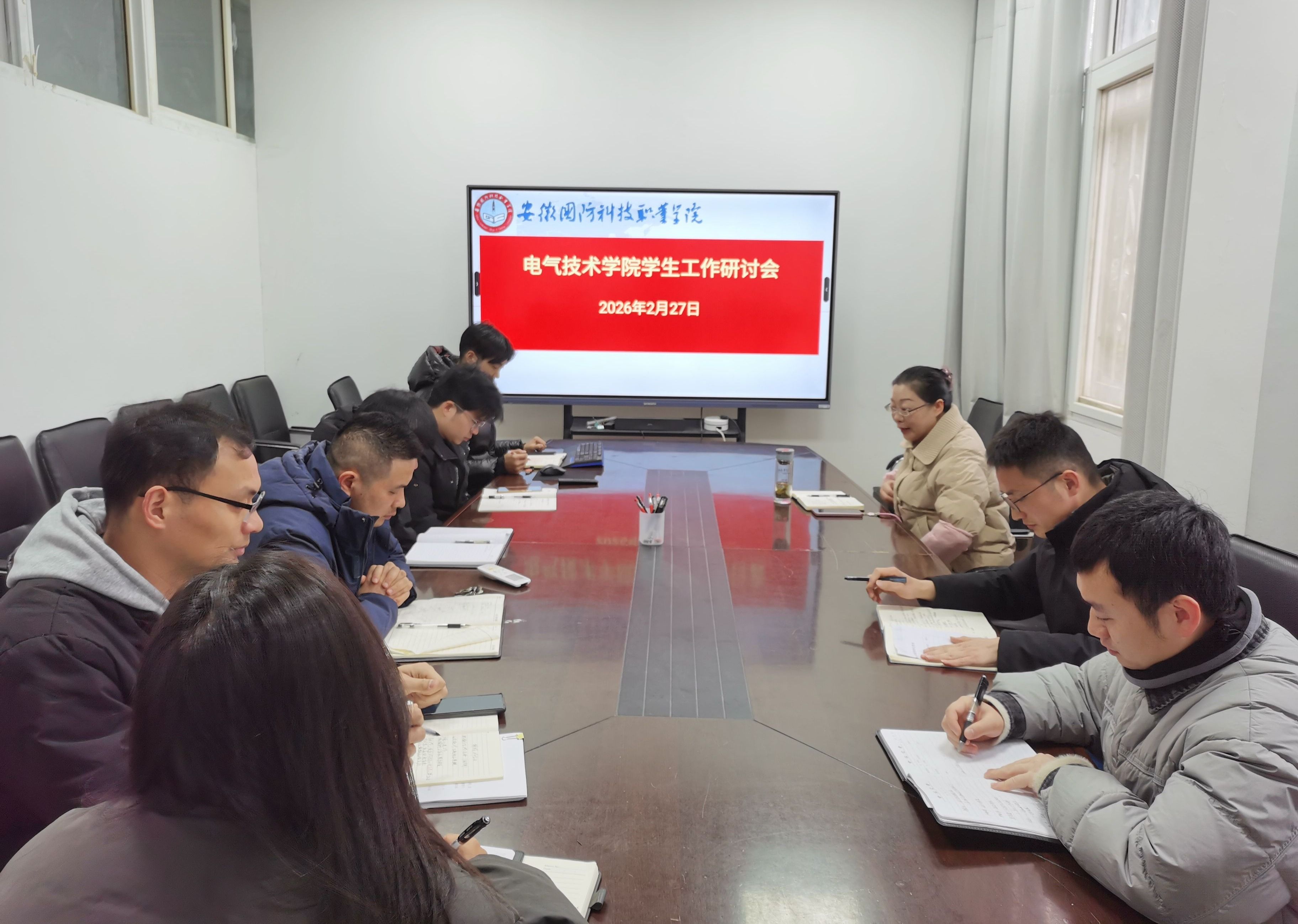 本网讯(电气技术学院 孙焕)为科学谋划2026年春季学期学生管理工作,明确工作方向、细化工作举措,扎实做好新学期学生工作,2月27日上午,电气技术学院在知行楼102室召开期初学生工作研讨会。学院党总支副书记张丽(主持工作)主持会议,全体专职辅导员参会。