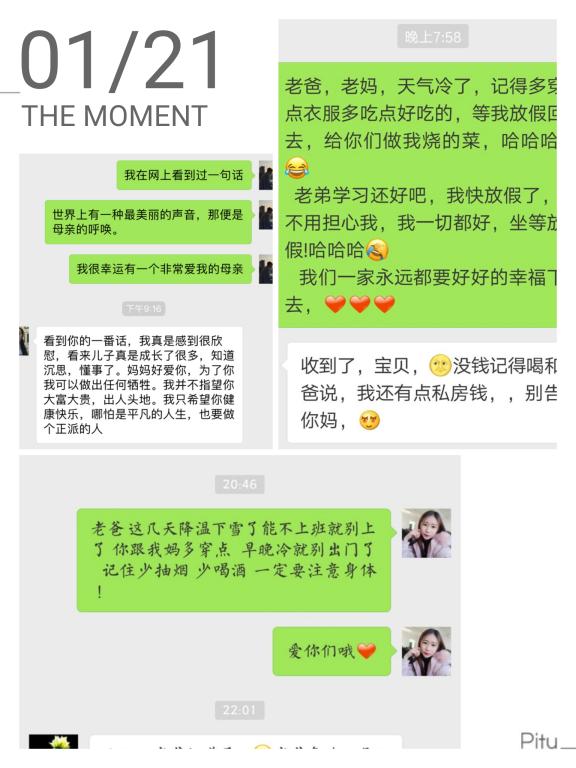 时值寒冬,但活动现场暖意融融。学生给家长们的短信内容既活泼俏皮,又感人至深;17轨道交通5班学生给父亲的信息中,表达出了自己对父亲浓浓的关爱;16空中乘务2班学生给父亲的短信,则很有生活的气息,体现了孩子与父亲间的互相信任;16空中乘务2班学生给母亲的短信,则彰显出了学生对母亲的敬意和母爱的伟大。