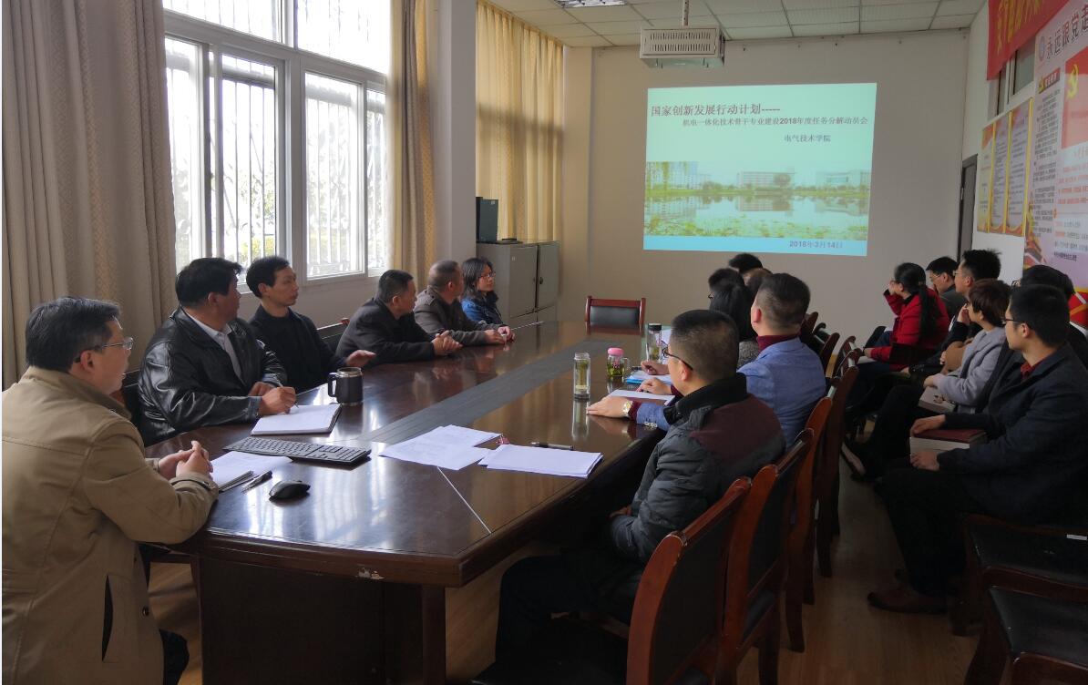 本网讯(电气技术学院 史媛芳)根据学校国家创新发展行动计划专业项目建设进度,3月14日下午两点半,电气技术学院组织召开了机电一体化技术骨干专业建设2018年度任务分解动员会,重点布置了2018年各项工作任务及分解落实工作。会议由电气学院院长李翔主持,全体教师参加了会议。