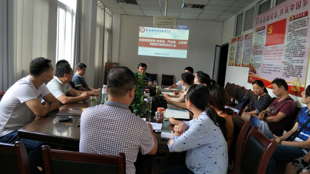 本网讯(经贸管理学院 许凤麟)为了扎实推进“讲忠诚、严纪律、立政德”专题警示教育,7月11日下午,经贸管理学院开展了“讲忠诚、严纪律、立政德”专题警示教育活动,活动由党总支书记杜先扬主持,校党委委员、副校长冯伦久,学院全体党员参加活动。