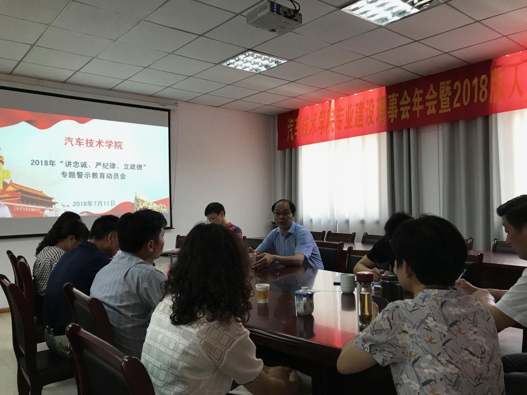本网讯(汽车技术学院 朱其阳)7月11日下午,汽车技术学院党总支召开“讲忠诚、严纪律、立政德”专题警示教育动员会,校长李麟书作为汽车技术学院第一党支部党员莅临指导。汽车技术学院党总支书记殷世江、院长黄道业和全体党员按时参加会议。会议由党总支副书记余桂刚主持。