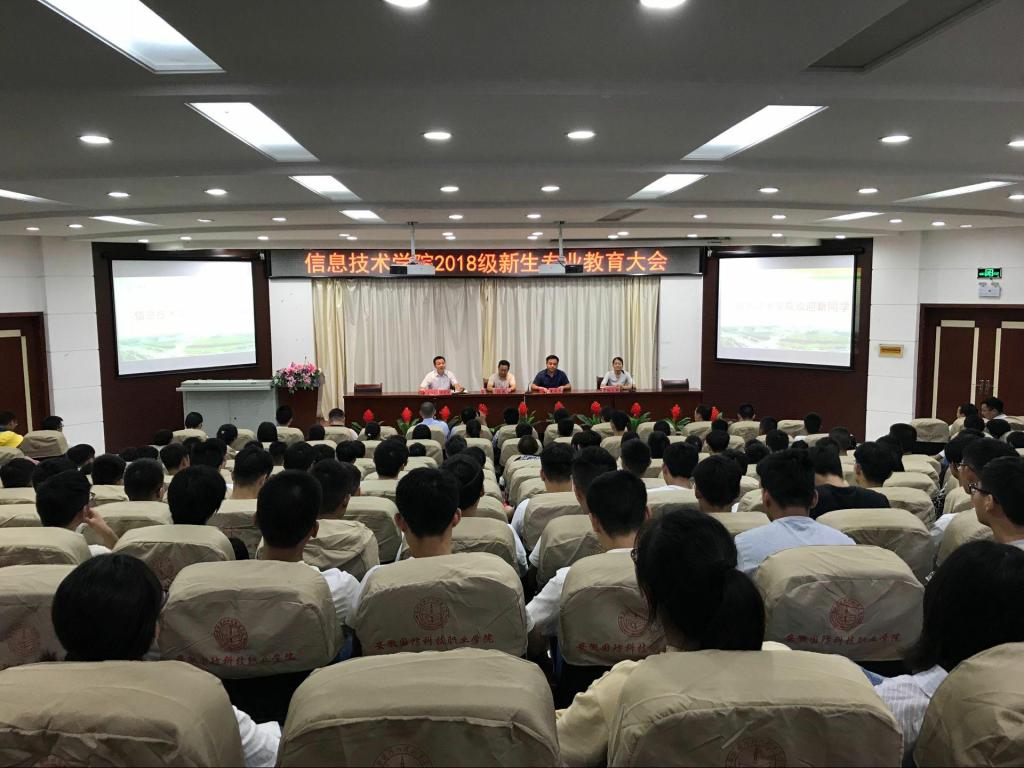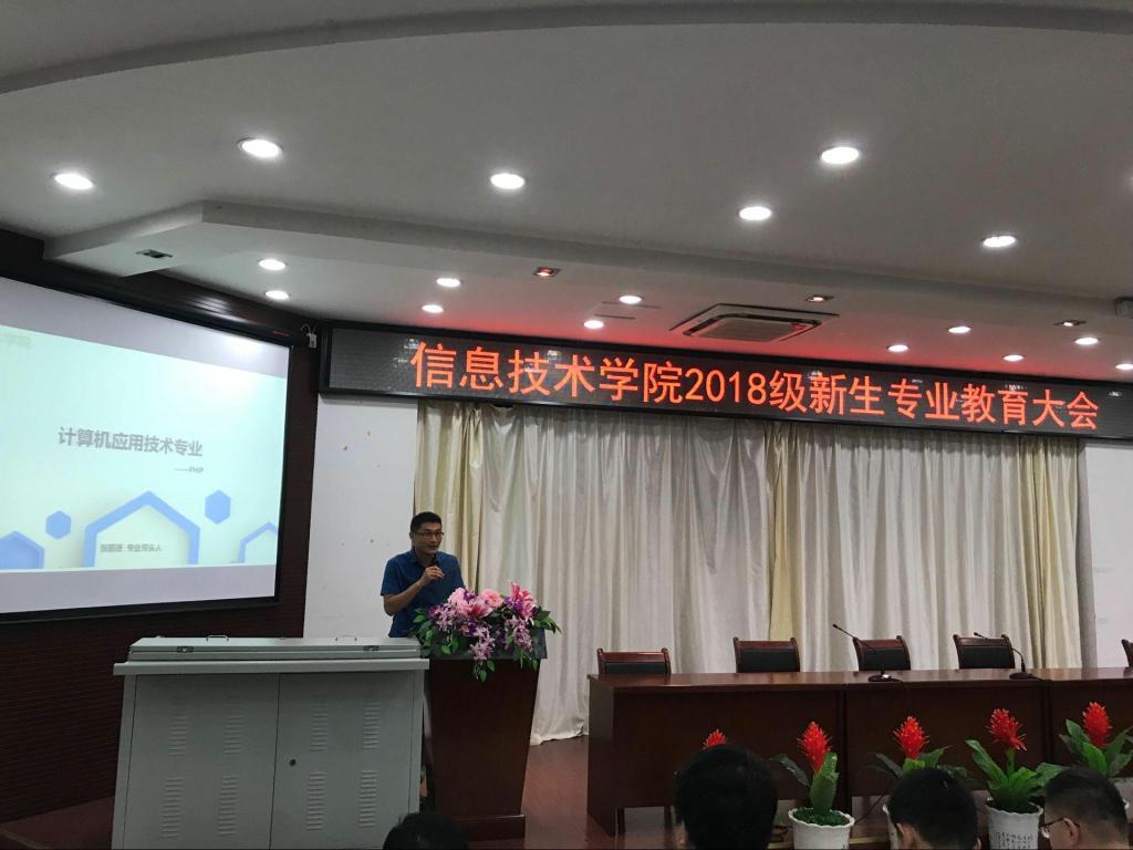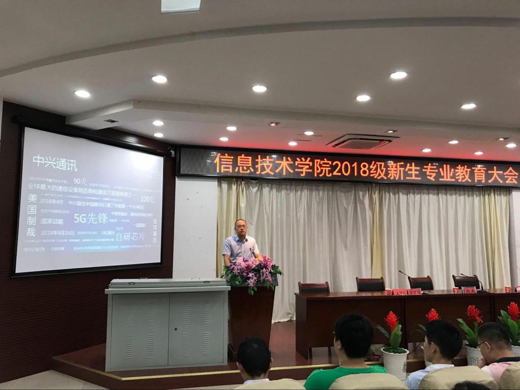 本网讯(信息技术学院 马士君)9月9日下午14:30,信息技术学院在图书馆报告厅举办2018级新生专业教育大会。校党委委员、信息技术学院院长黄存东、党总支书记孙武、副院长沙有闯、总党支副书记杨庆颖,骨干教师、各专业带头人,2018级辅导员、班主任及2018级全体新生参加了会议,会议由副院长沙有闯主持。会议还邀请到了中兴通讯、伟创聚赢等校企合作企业的有关负责人。
