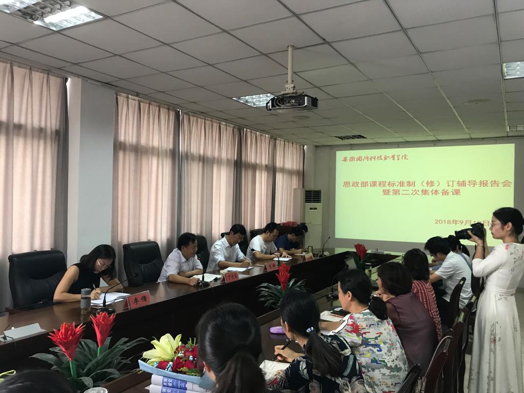 本网讯 9月19日下午,思政部课程标准制(修)订辅导报告会暨第二次集体备课在行政楼403会议室如期举行。校党委委员、副校长丁守宝教授应邀作了课程标准制(修)订专题辅导讲座,会议由校党委委员、宣传部长、思政部主任袁旗主持,全体思政部教师参加了报告会。