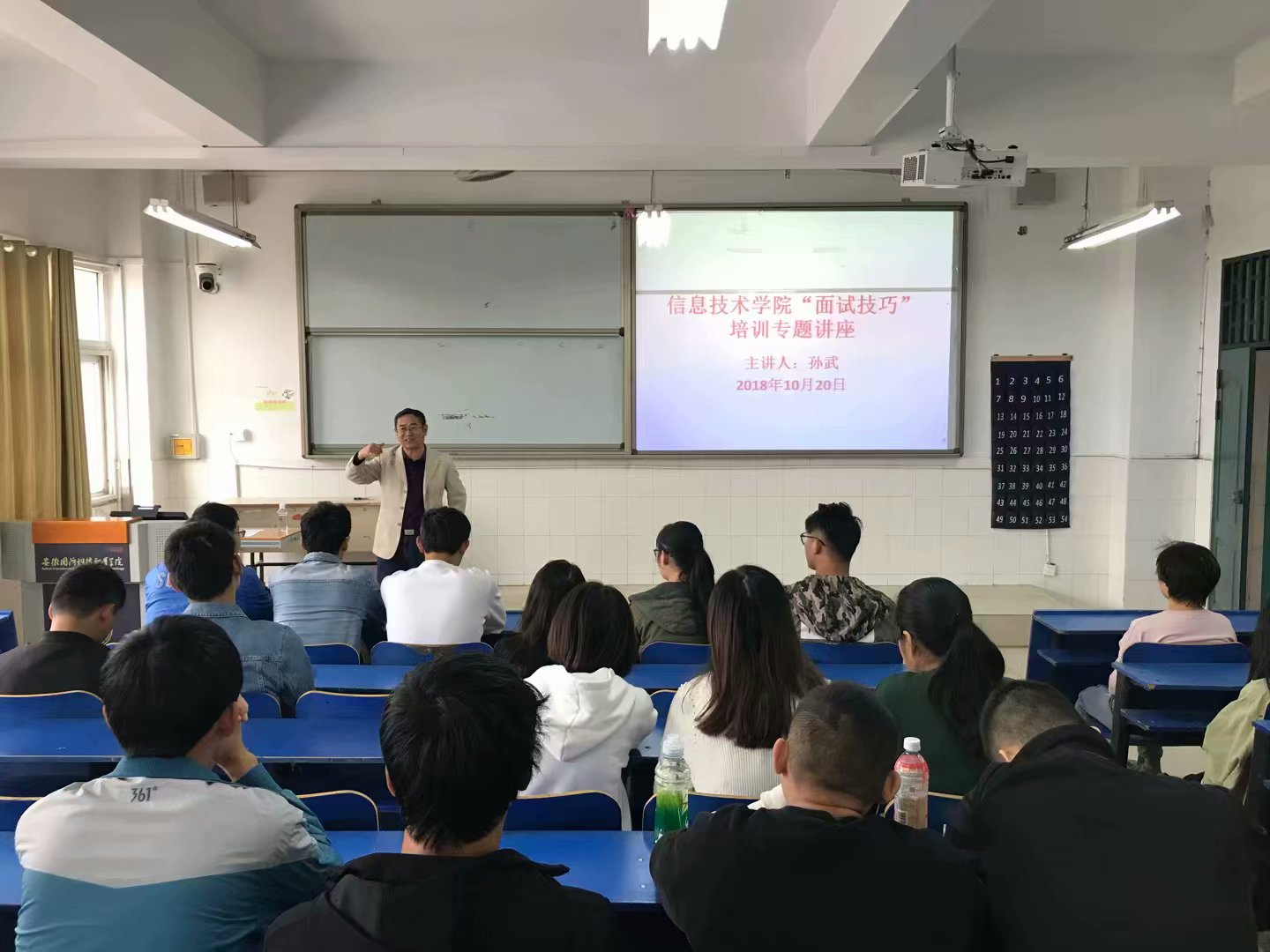 本网讯(信息技术学院 马士君)16级学生顶岗实习在即,为了帮助同学们树立正确的就业、择业和创业观,在求职面试时达到事半功倍的效果,增强就业竞争力,10月20日上午9点,信息技术学院在教二楼205教室组织开展了16级学生“面试技巧” 培训专题讲座,院党总支书记孙武主讲。