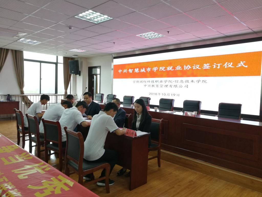 校党委委员、信息技术学院院长黄存东、信息技术学院党总支书记孙武、中兴教育总经理许高山、中兴智慧城市学院院长王干和2018级中兴通讯就业班50名同学共同出席本次签订仪式,仪式由信息技术学院党总支副书记杨庆颖主持。