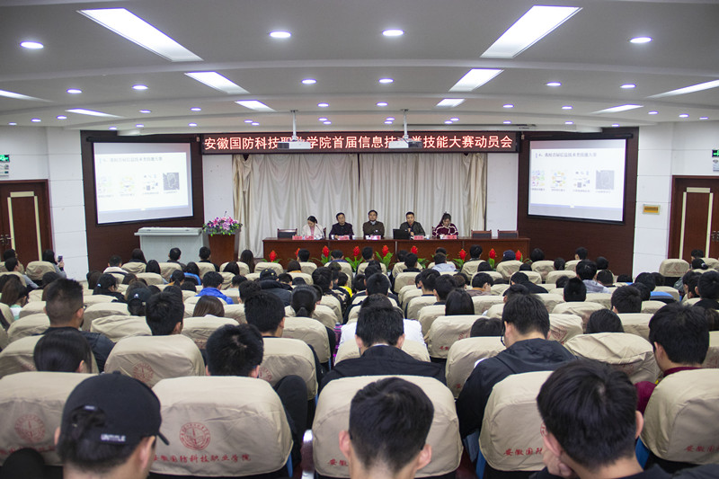 本网讯 (信息技术学院 马士君)为切实做好2018年万象城体育awcsport首届信息技术类技能大赛的备战工作,真正将“以赛促教、以赛促学、以赛促改、以赛促建”落到实处,调动学生学习专业技能的积极性,推动优良学风建设,11月7日下午,信息技术学院在图书馆报告厅召开校首届信息技术类技能大赛动员会。学校党委委员、信息技术学院院长黄存东、院党总支书记孙武、副院长沙有闯、院党总支副书记杨庆颖、院团总支书记陈晨出席会议,全体教职工及院2017、2018级学生参加了此次会议。会议由杨庆颖主持。