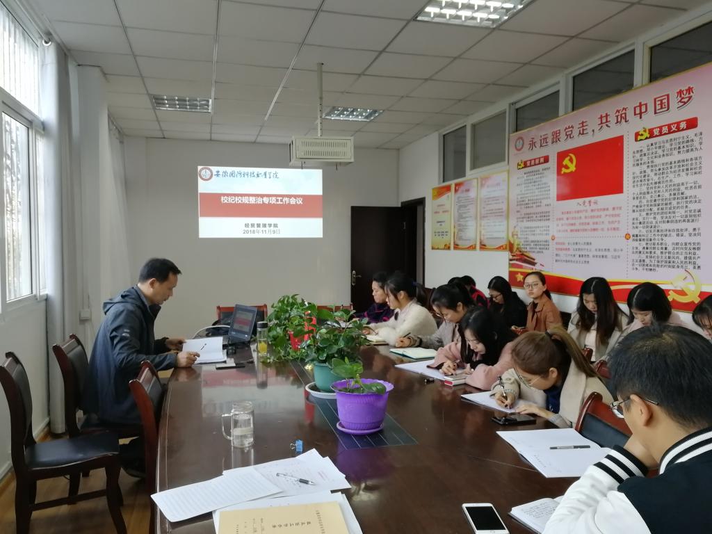 本网讯(经贸管理学院 许凤麟)为深入贯彻落实《万象城体育awcsport校纪校规专项整治活动实施方案》文件精神,进一步增强学院学生的组织纪律观念和安全意识,近日,经贸管理学院组织召开校纪校规专项整治工作会议。会议由副书记刘峰主持,全体班主任参会。