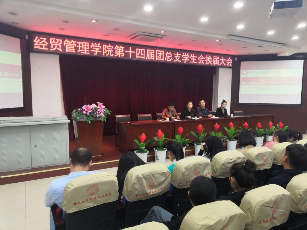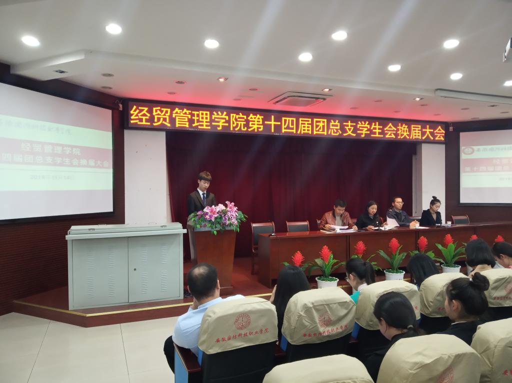 本网讯(经贸管理学院学生通讯员 汪德强)为加强学生干部队伍建设,11月14日下午,经贸管理学院在图书馆报告厅举行团总支学生会换届大会,辅导员张锐老师、交通运输学院学工部主任李海涛、团学指导老师刘静涵、18级各班班主任及院全体学生干部参会,会议由团总支书记付玉梅主持。