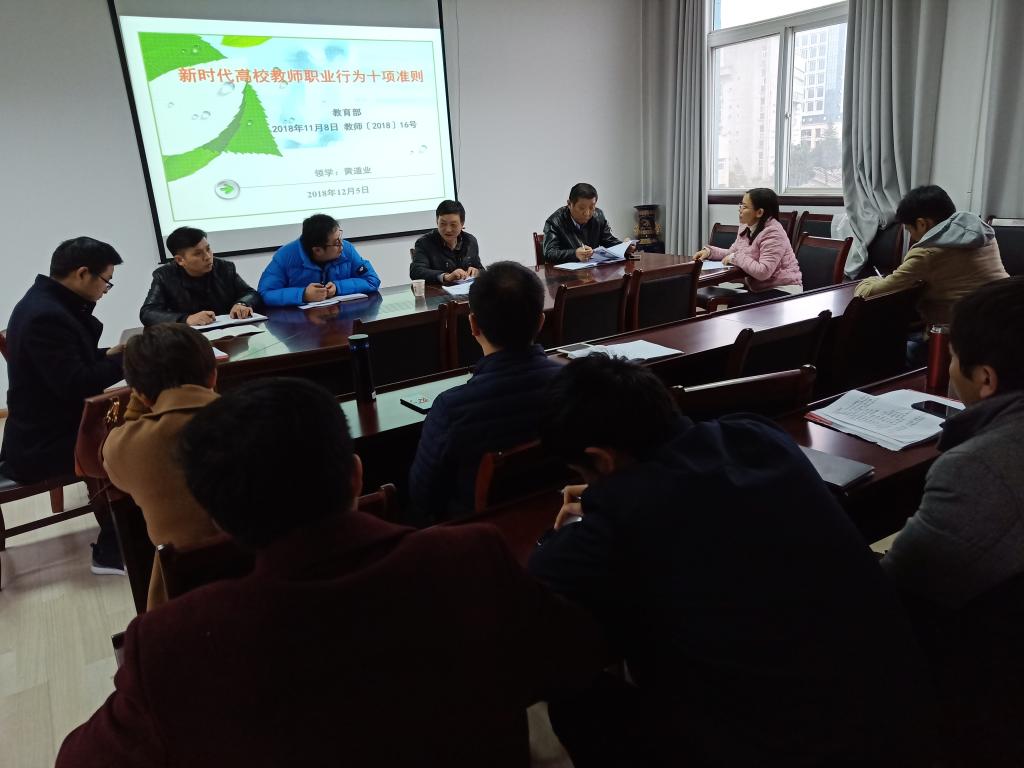 本网讯 为深入学习宣传党的十九大精神和习近平新时代中国特色社会主义思想,进一步贯彻落实全国教育大会精神,深化师德师风建设,提升汽车技术学院广大教职工的师德水平和增加底线意识,12月5日下午,汽车技术学院在院416会议室组织开展学习教育部《新时代高校教师职业行为十项准则》活动。活动由党总支书记殷世江主持。全体教职工参加了学习活动。学院院长黄道业传达了教育部教师[2018]16号《教育部关于印发〈新时代高校教师职业行为十项准则〉,并对《准则》进行了细致的解读。