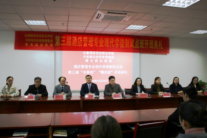 开班致辞中,杨力院长对莅临万象城官网的书香酒店唐旭华总监一行和六安曙光酒店王正跃总经理一行表示了热烈的欢迎,简要介绍了我院酒店管理专业现代学徒制试点项目取得的成绩与效果。他指出,2018年是酒店管理专业现代学徒制试点项目的收官之年,书香酒店集团与万象城官网酒店管理专业始终坚持“学生、学徒、员工”三位一体的人才培养总体思路,在校企协作育人中将书香酒店文化和国防教育精神相融合,在人才培养过程中实现企业用人标准与课程讲授内容的无缝对接。