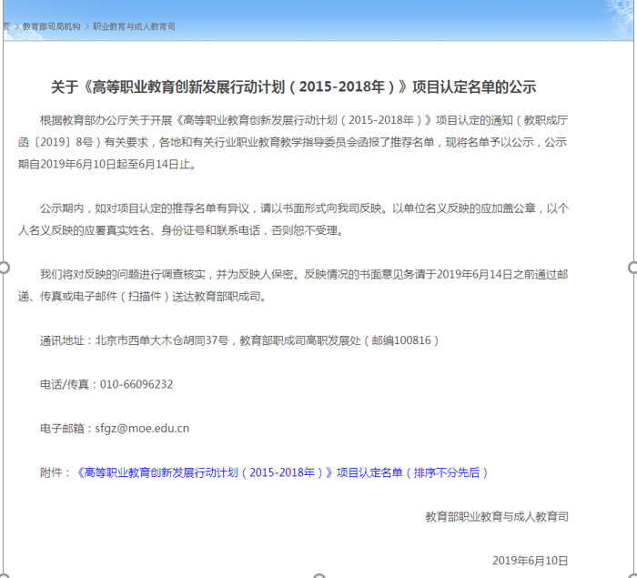 6月10日,教育部办公厅关于《高等职业教育创新发展行动计划(2015-2018年)》项目认定名单的公示,学院计算机网络技术骨干专业、校企共建信息安全与管理“双师型”教师培养培训基地、高分辨率对地观测系统数据应用技术协同创新中心三个项目名列其中,这是学院全体师生智慧和劳动的结晶。