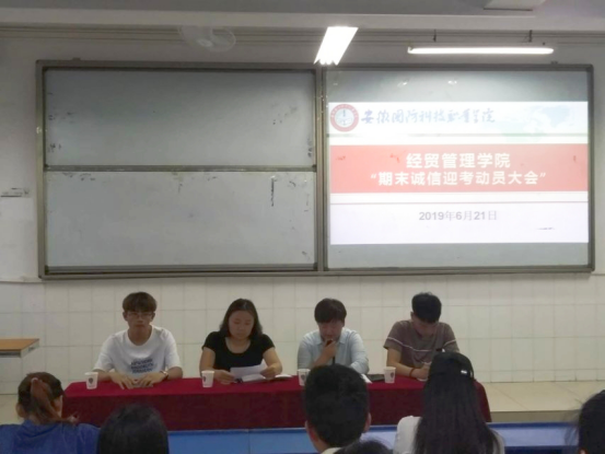 本网讯 为做好期末诚信考试工作,营造积极向上的学习氛围,形成良好考风考纪,经贸管理学院于2019年6月21日晚在二教105教室召开期末期末诚信迎动员大会。经贸管理学院团总支书记付玉梅、辅导员许凤麟及各班级班长、团支书、学习委员、学生代表共180人出席大会。