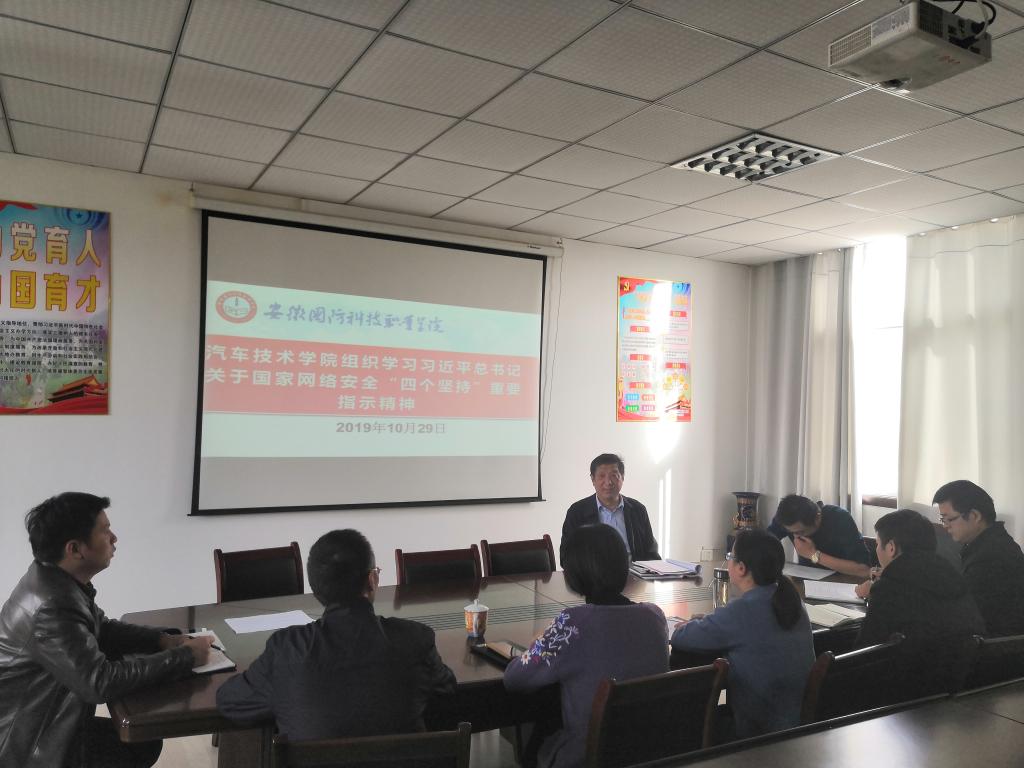 本网讯(汽车技术学院 戴柳)为了增强党员职工网络安全意识,筑牢网络安全防线,2019年10月29日下午,汽车技术学院在知行楼416会议室组织召开学习贯彻习近平总书记关于网络安全“四个坚持”重要指示精神专题会议。会议由汽车技术学院党总支副书记余桂刚主持,全体职工党员参加。