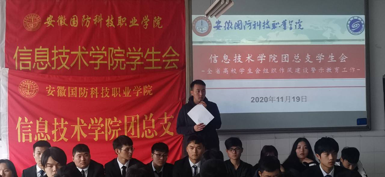 本网讯 2020年11月19日,为深化学生会改革,加强学生会作风建设,信息技术学院团总支学生会在二教205室举行了学生会组织作风建设警示教育工作会议。本次会议由信息技术学院团总支老师孙颖凯主持,信息技术学院团总支学生会全体成员参加会议。