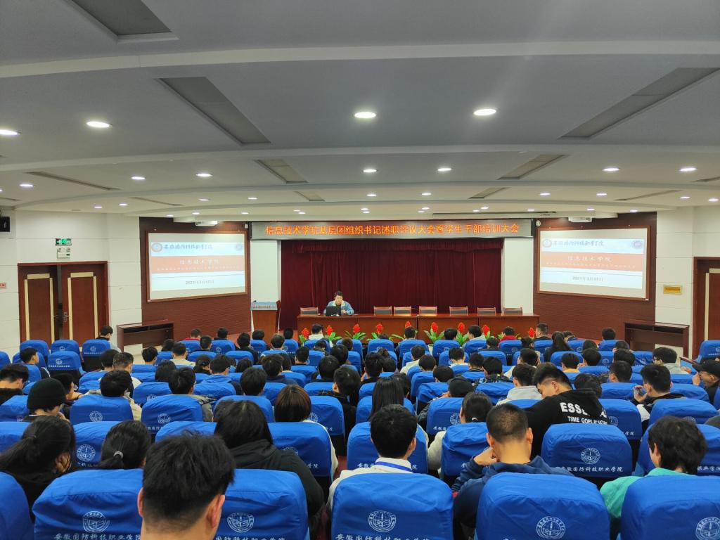 本网讯(信息技术学院 孙颖凯)本网讯 为深入贯彻落实上级关于从严治团的指示精神,推动基层班级团支部各项工作有效开展,根据校团委的工作部署,3月17日下午16:00,信息技术学院团总支在图书馆报告厅举行2020年度基层团支部书记述职评议会暨学生干部培训大会,学院辅导员兼团总支负责人孙颖凯应邀出席会议并担任评委,学院第十三届团总支委员、各班团支部书记、各班班长、团总支学生会部分学生干部参加会议。