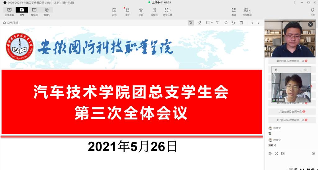为进一步做好疫情防控工作,推进团学工作有序开展,5月26日下午16:30,汽车技术学院利用腾讯会议软件线上召开了团总支学生会第三次全体会议。汽车技术学院团总支朱其阳老师主持会议并讲话,第八届团总支学生会全体同学按时参加。