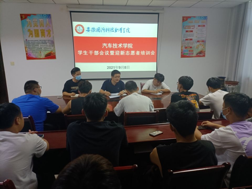 本网讯(汽车技术学院 朱其阳)为深入贯彻落实2021年秋学期学校迎新专题工作会议精神,持续推进从严治团和团组织规范化建设,积极部署好新学期迎新及团学各项工作,9月8日下午17:30,汽车技术学院在知行楼416会议室召开全体学生干部会议暨迎新志愿者培训会。汽车技术学院团总支负责人朱其阳出席会议,全体学生会成员及迎新志愿者参加会议。会议由第九届学生会主席黄子文同学主持。