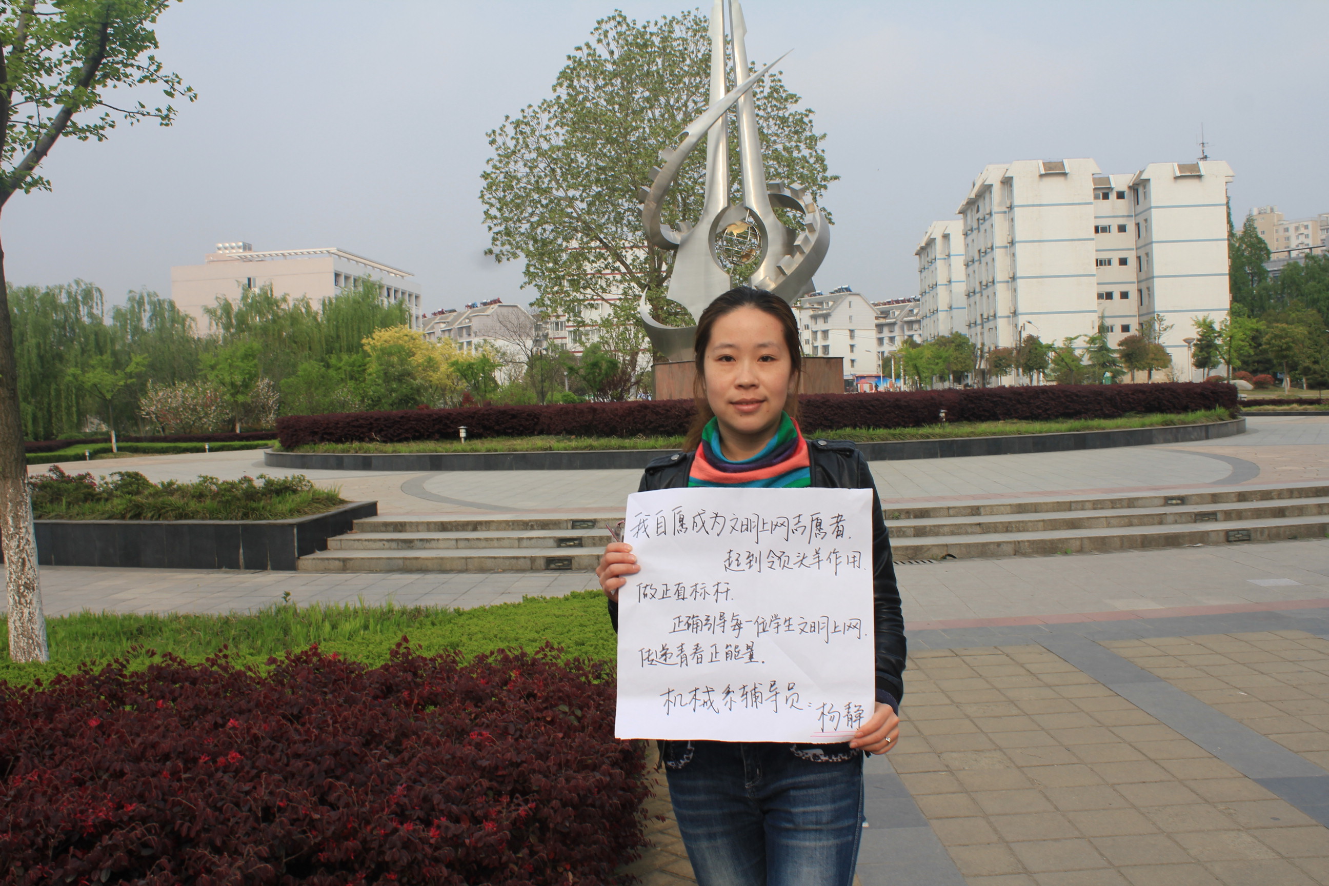 我自愿成为文明上网志愿者,起到领头羊作用,做正直标杆,正确引导每一位学生文明上网,传递青春正能量。--机械系辅导员:杨静