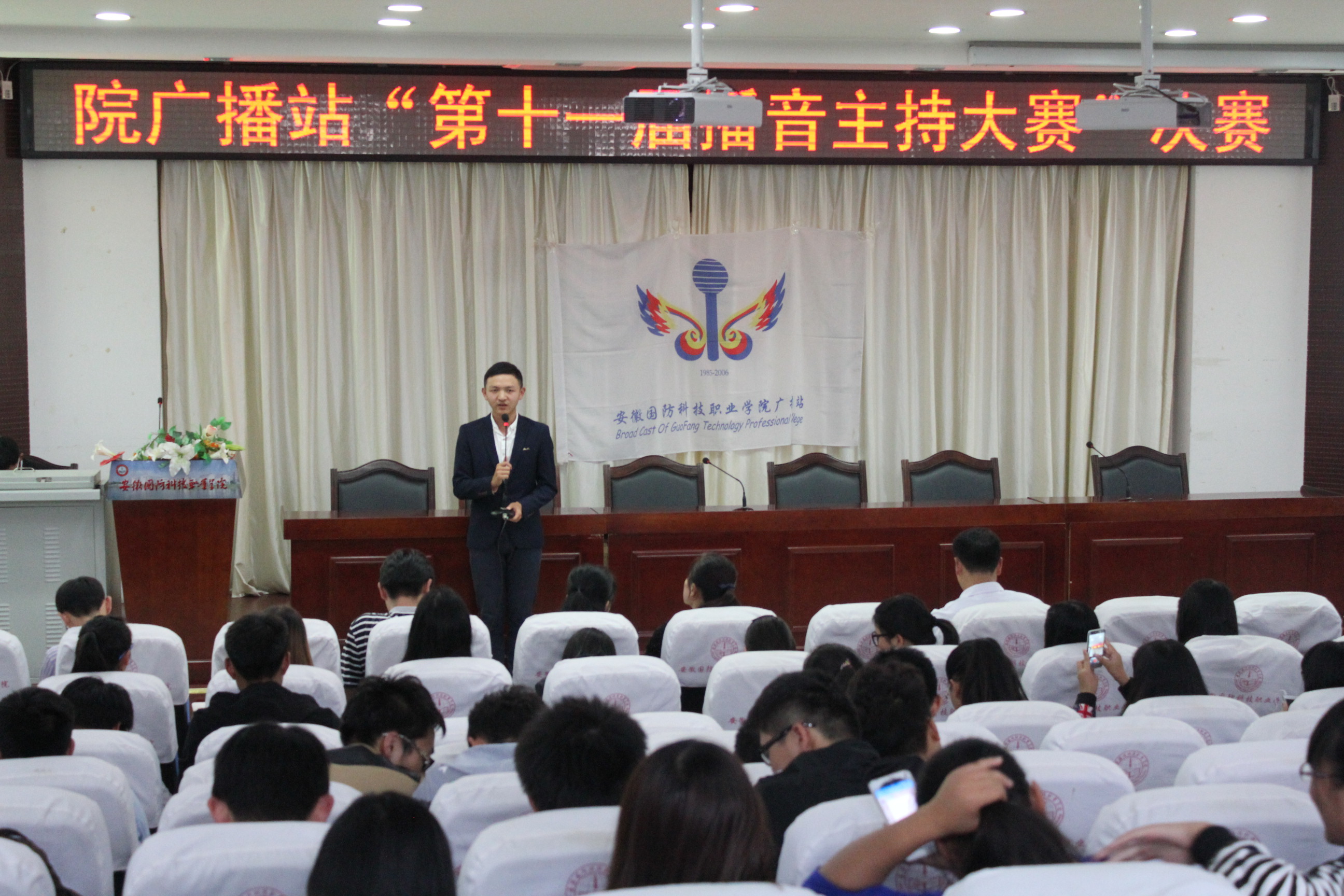 为进一步丰富同学们的课余生活,增强大学生综合素质,展示当今大学生的青春风采,推动万象城官网精神文明建设,2015年10月23日下午,由院团委主办,院广播站承办的“炫主持,展精彩”第十一届播音主持大赛决赛在院图书馆报告厅隆重举行,本次比赛由院团委副书记张伟业、各系团总支书记以及团委老师担任评委。