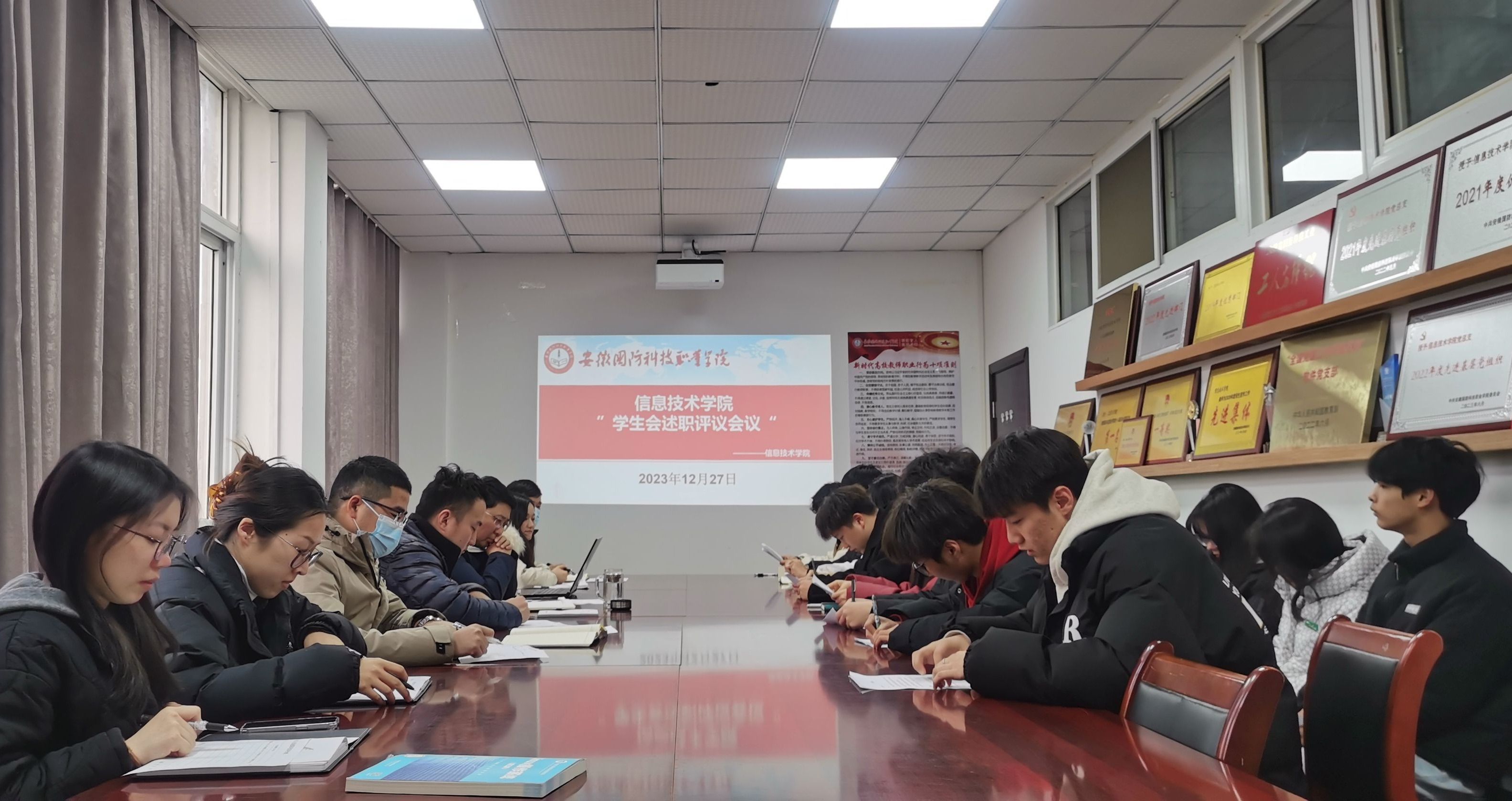 本网讯(信息技术学院 孙颖凯)为贯彻落实《关于推动高校学生会(研究生会)深化改革的若干意见》(中青联发〔2019〕9号)有关要求,为进一步加强学生干部队伍建设,充分发挥学生干部的积极性与主动性,有效衡量学生会工作成效和作风建设,全面准确地掌握学生干部的工作情况。12月27日下午,信息技术学院于知行楼304召开2023-2024学年第一学期学生会述职评议工作会议,学院党总支书记王胜、辅导员马士君、杜洪宇、韦志魁、严晓曼、陈艳出席会议,学院学生会主要学生干部和学生代表参加了会议,会议由学院团总支书记孙颖凯主持。