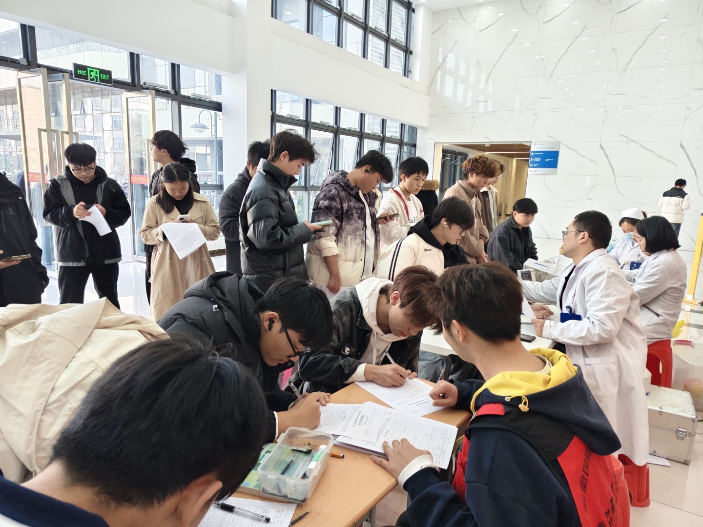 活动当天上午八点,青年志愿者提前到场,高效完成物资搬运、帐篷搭建、现场布置等筹备工作。活动期间,志愿者全程引导同学们有序完成填表、量血压、验血、抽血等流程,耐心缓解大家的紧张情绪,并细致叮嘱献血后注意事项,以专业贴心的服务保障活动安全有序推进。