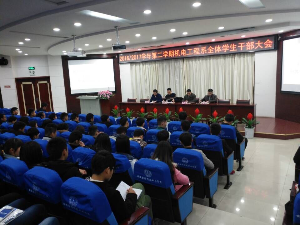 3月13日,晚16:30,机电系在图书馆报告厅召开了全体学生干部大会会议。党总支书记陈兆同、党总支副书记罗威、团总支书记张红军、辅导员杨志清老师、侯超众老师和系属全体学生干部参加了本次大议。会议由杨志清主持。